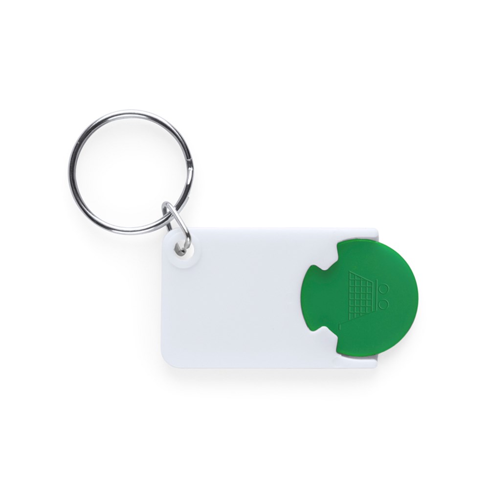 Münz-Schlüsselanhänger mit fröhlichem zweifarbigem Design in verschiedenen Farben und herausnehmbarer Münze.