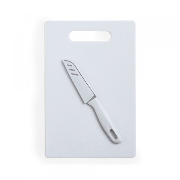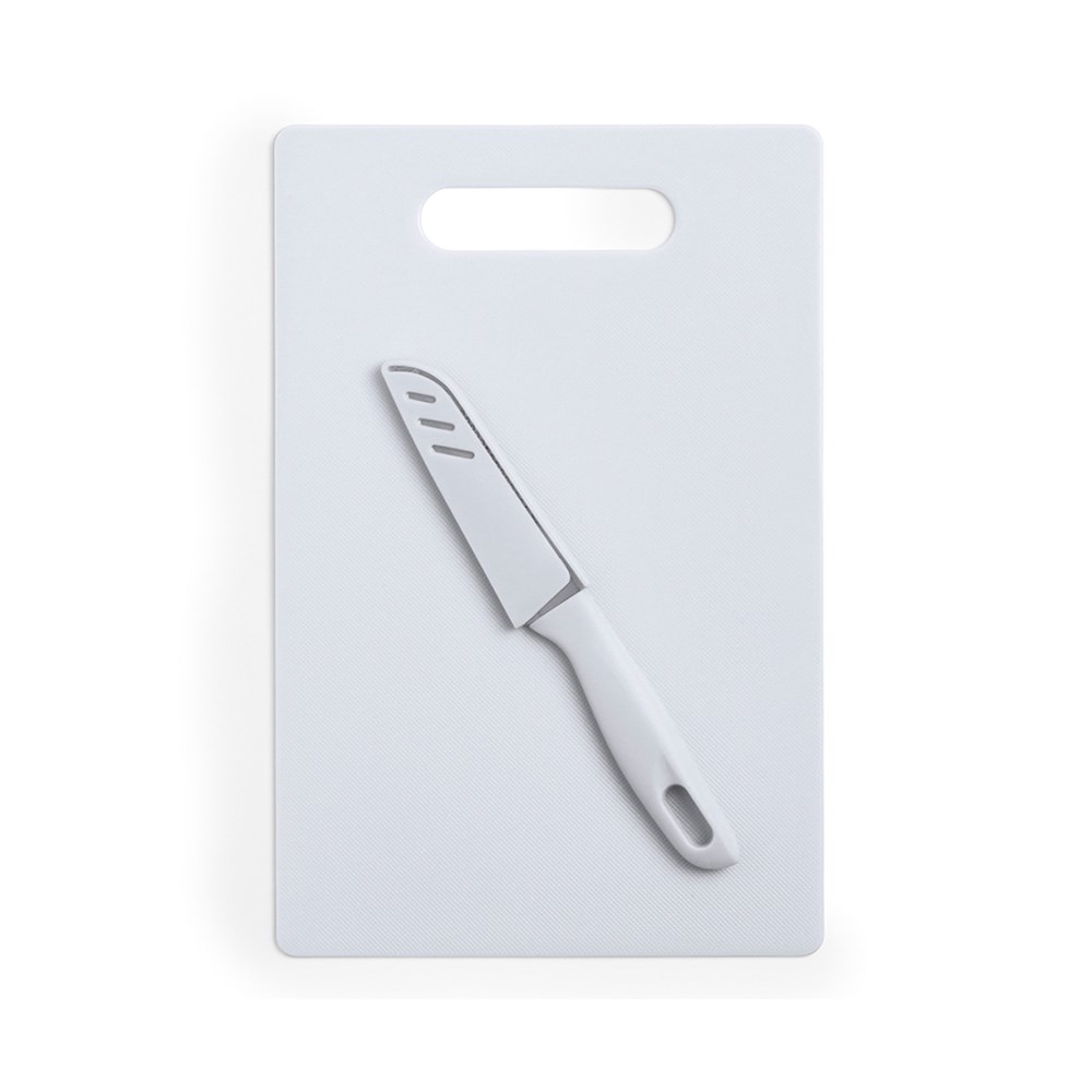 Küchenset aus Schneidebrett und Messer in verschiedenen lebendigen Farben. Brett aus resistentem Material mit Stanzung für einfache Handhabung. Messer mit Klinge aus Edelstahl und Wellenschliff sowie integriertem Flaschenöffner. Mit ergonomischem Griff mit Stanzung und Sicherheitshülle.
