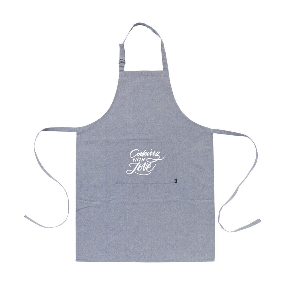Öko-Schürze aus gemischter, recycelter Baumwolle (160 g/m²). Mit aufgesetzter Tasche. Das Umhängeband kann mit einer Metallschnalle eingestellt werden. Langlebig und umweltfreundlich.