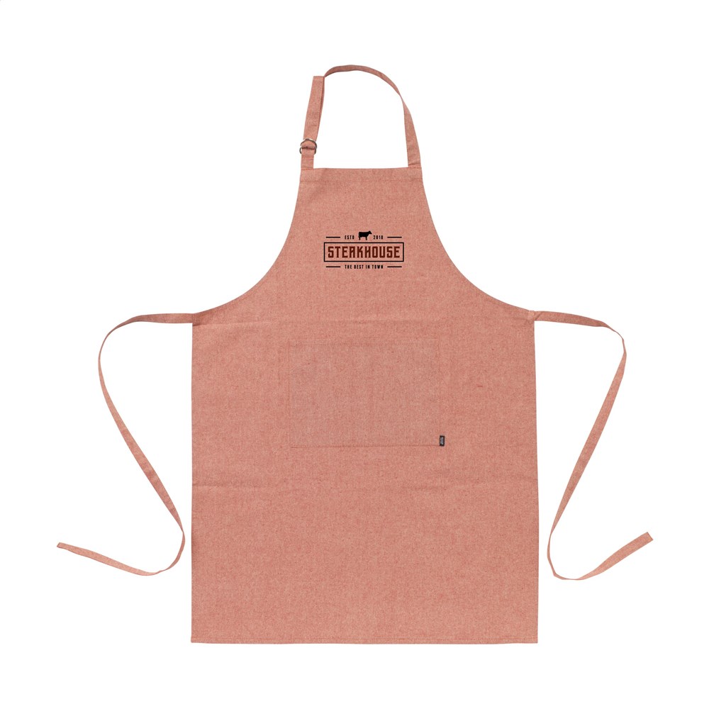Öko-Schürze aus gemischter, recycelter Baumwolle (160 g/m²). Mit aufgesetzter Tasche. Das Umhängeband kann mit einer Metallschnalle eingestellt werden. Langlebig und umweltfreundlich.