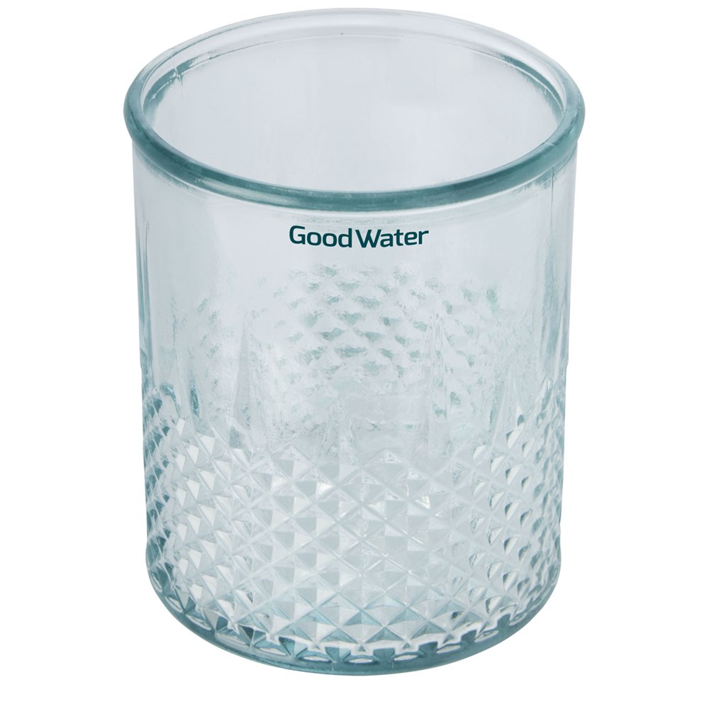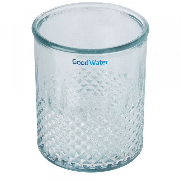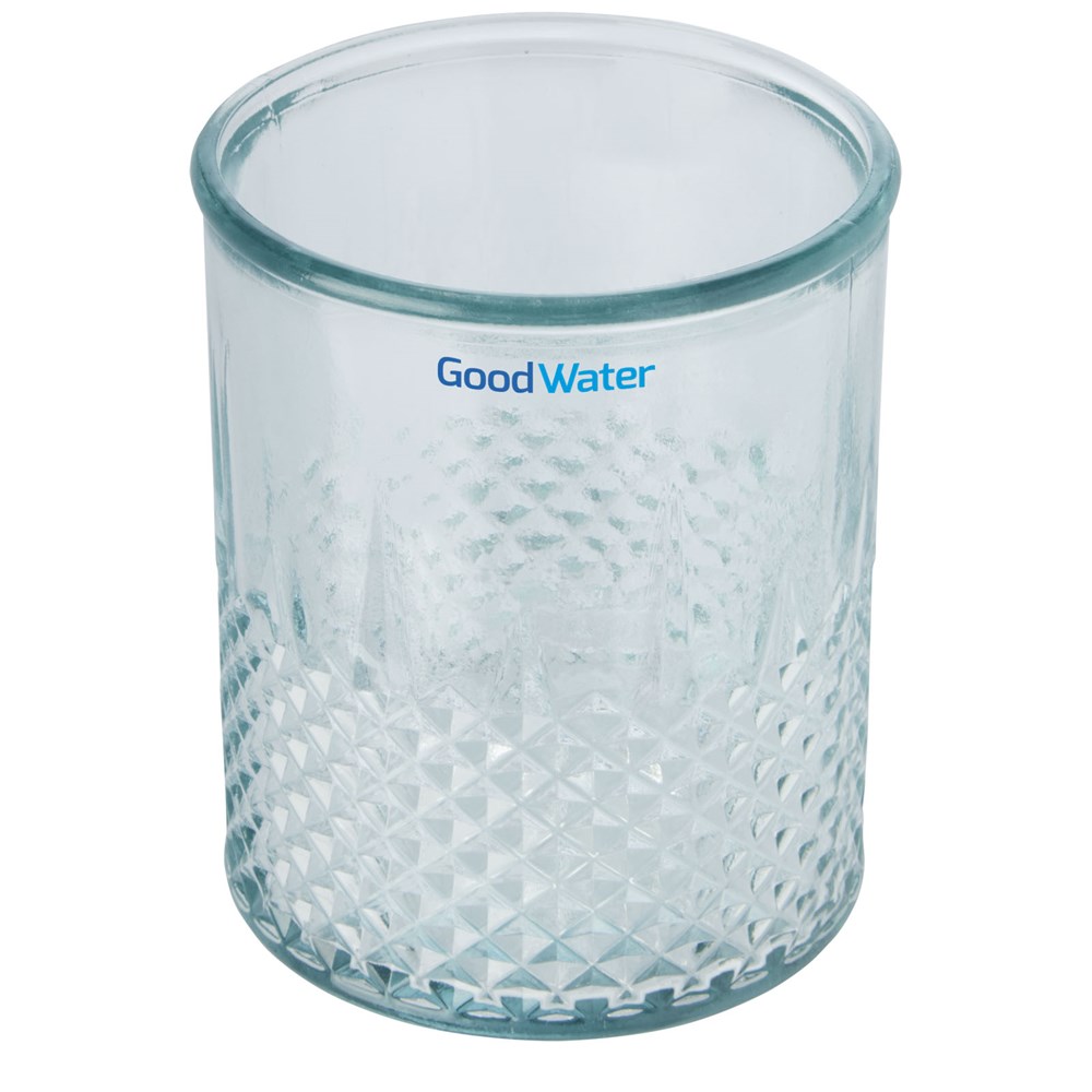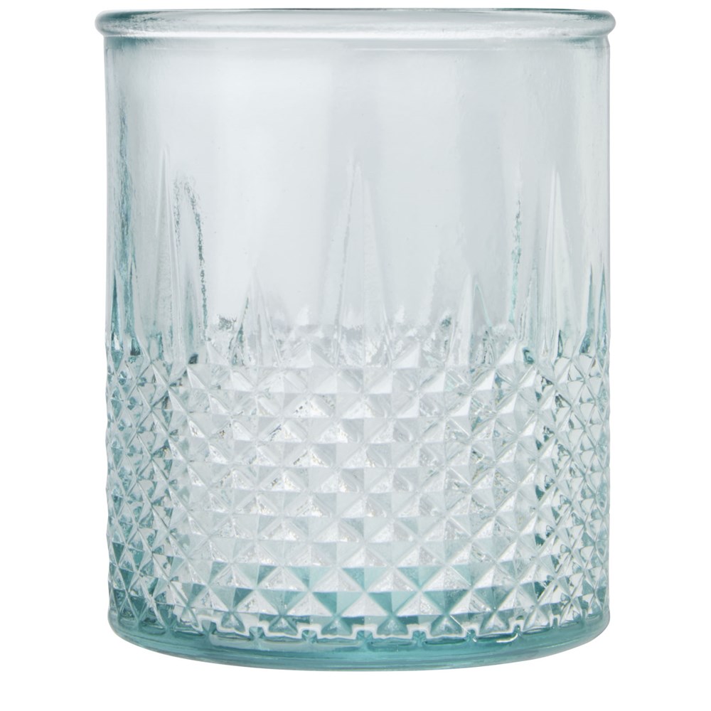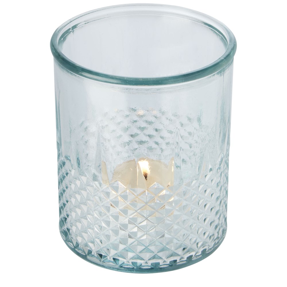 Teelichthalter aus recyceltem Glas mit Diamanteffekt. Hergestellt aus 1 Glasflasche. Recyceltes Glas wird mit weniger Energie, Rohstoffen und Additiven hergestellt als für die Herstellung von herkömmlichem Glas erforderlich. Teelicht nicht enthalten.