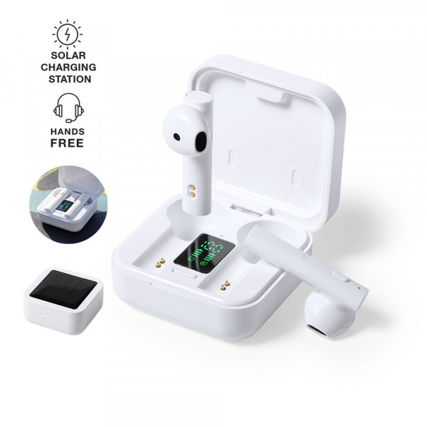 In-Ear-Kopfhörer in elegantem Weiß und mit Bluetooth® 5.0-Anschluss. Mit im Deckel integriertem Solarladepanel und internem LCD-Display mit Ladestatusanzeige. Ergonomisch gestaltet, mit integrierter Bedientaste an der Hörmuschel, mit passender Basis. Freisprechfunktion und wiederaufladbar mit Solarenergie oder Micro-USB-Kabel -im Lieferumfang-. Präsentiert in einem hochwertigen, mit Scharnieren zu öffnenden Einzeletui in einer attraktiven Designerbox, mit Bedienungsanleitung in Englisch und Spanisch.