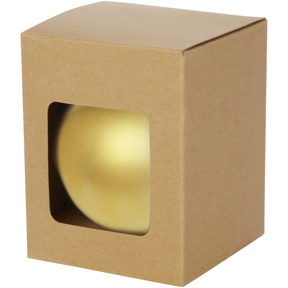 Weihnachtskugel mit glänzendem Finish, einem runden Aufhänger und einer 5,5 cm langen Schnur. Individuelle Geschenkbox aus Kraftpapier mit Frontfenster zur Sichtbarkeit der Werbeanbringung.