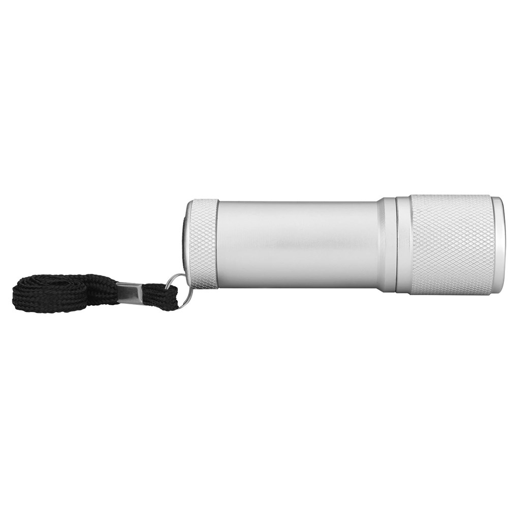 Taschenlampe mit 9 weißen LEDs mit Ein/Aus-Drucktastenschalter und Trageschlaufe. Mit Geschenkkarton mit EVA-Einlage und inkl. 3 x AAA Batterien.