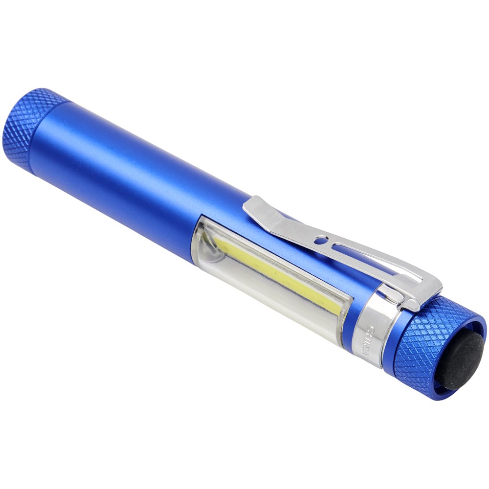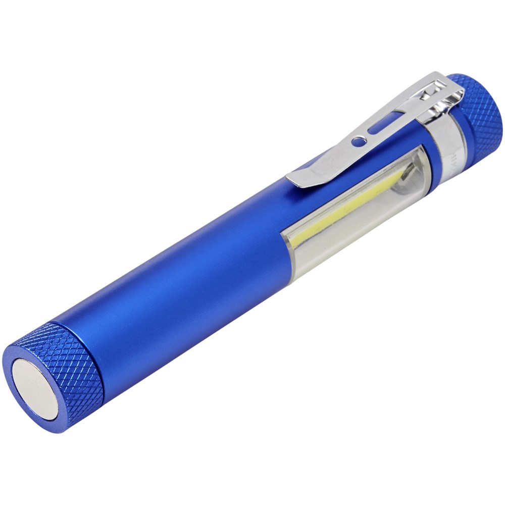 Eine praktische COB-Taschenlampe aus Aluminium mit Magnetfuß und Taschenclip. Wird mit 5 LR44-Batterien betrieben und produziert 42 Lumen. Große Logodekorationsfläche sowohl für Tampondruck als auch für Lasergravur verfügbar.