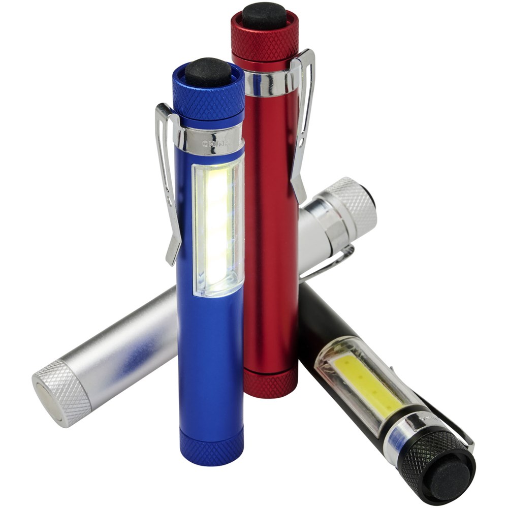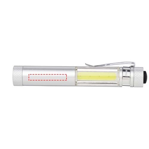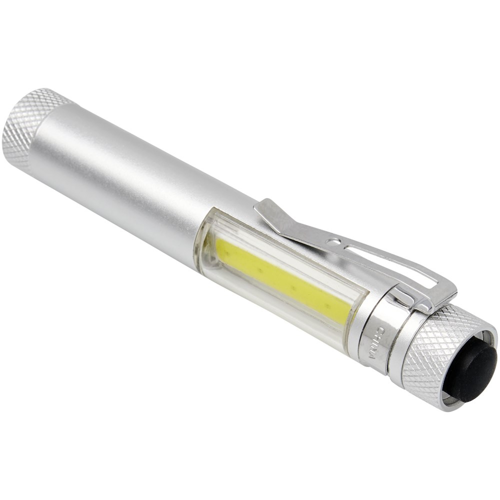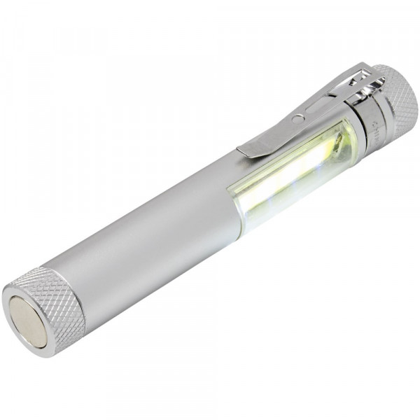 Eine praktische COB-Taschenlampe aus Aluminium mit Magnetfuß und Taschenclip. Wird mit 5 LR44-Batterien betrieben und produziert 42 Lumen. Große Logodekorationsfläche sowohl für Tampondruck als auch für Lasergravur verfügbar.