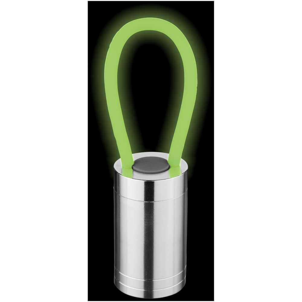 Die Taschenlampe mit den 6 weißen LEDs kommt mit einem farblich passenden, im Dunklen leuchtenden Silikonband und mit einer An-/Aus-Taste auf der Rückseite. Mit Batterien.