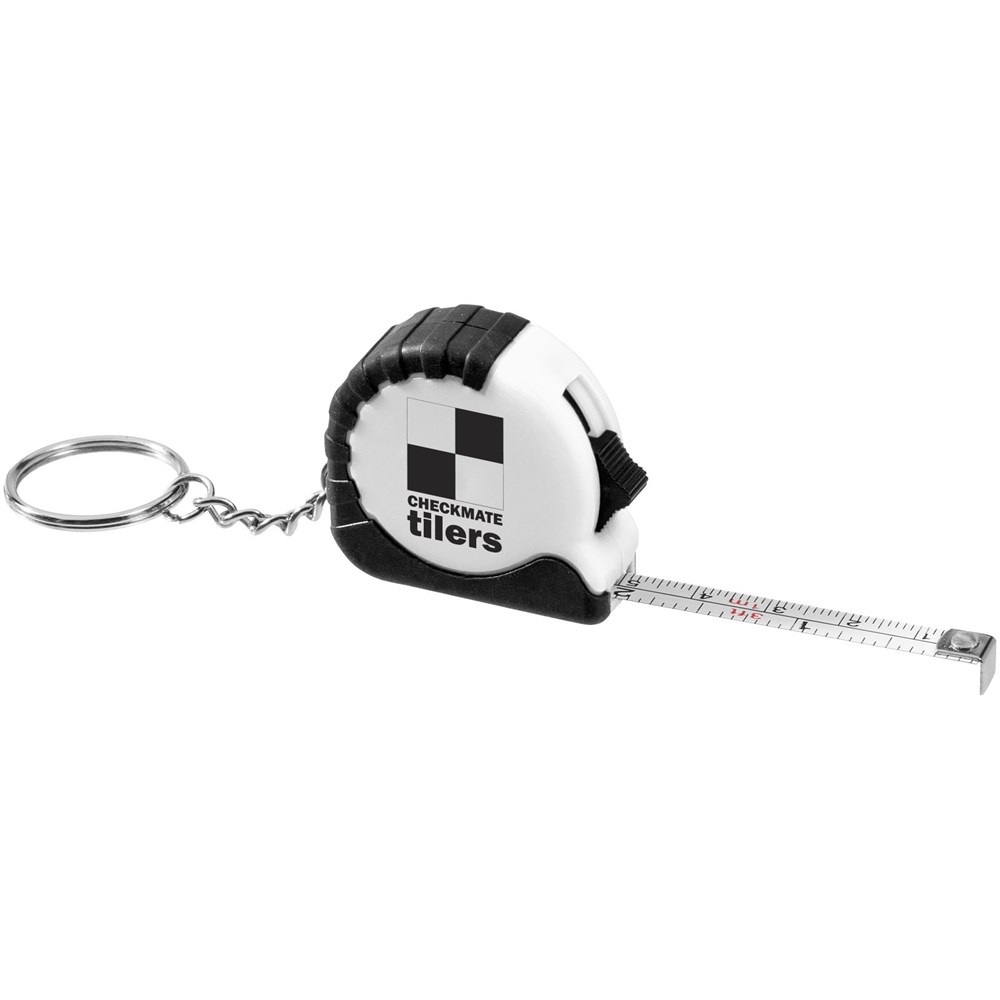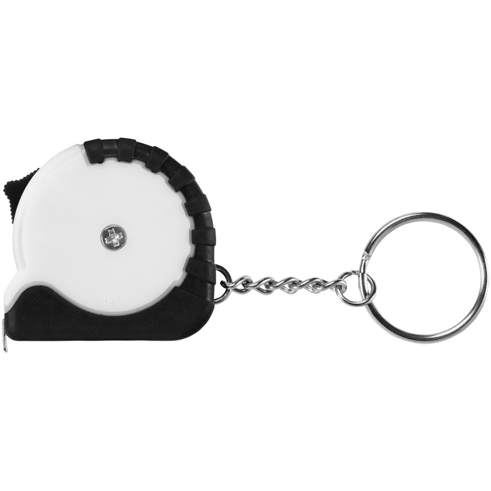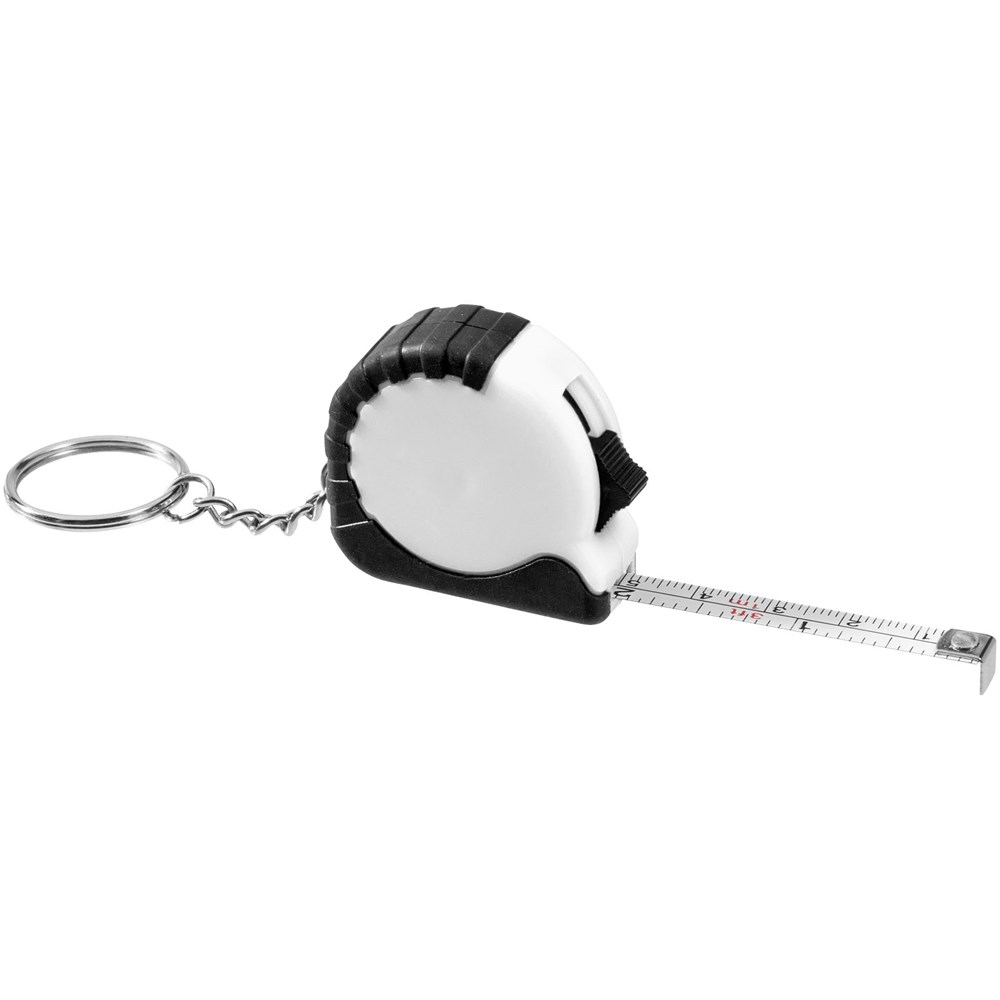 1 Meter langes, einziehbares, einrastendes Maßband zeigt Zentimeter und Zoll an. Schiebetaste zum Verriegeln des Maßbandes. Gummigriff. Schlüsselanhänger mit geteiltem Ring aus Metall.