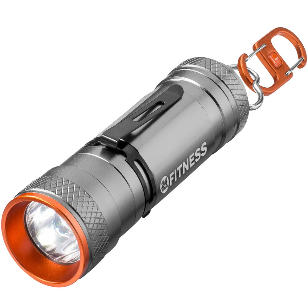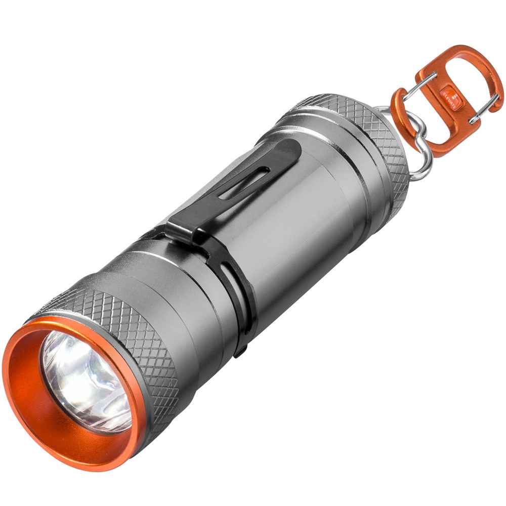 Taschenlampe/Laterne mit doppelter Verwendung verfügt über helle 3-W-CREE-LED mit 4 Lichtmodi und Zoomfunktion. Die Laterne kann entweder stehend oder hängend mithilfe des exklusiv gestalteten doppelten Karabiners verwendet werden. Mit abnehmbarer Metallfeder mit Positionierung vorne und hinten. Handbuch in EN/FR/DE/IT/ES/NL wird mitgeliefert. Verpackt in einem Elevate Geschenkkarton. Batterien mitgeliefert und eingelegt. Exklusives Design.