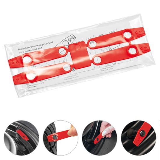 mit Reifenprofiltiefenmessern und Ventilkappendrehern, inkl. Gebrauchsanweisung (D/GB/F/E) und Einzelverpackung in Polybeutel