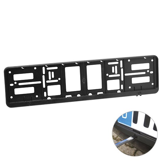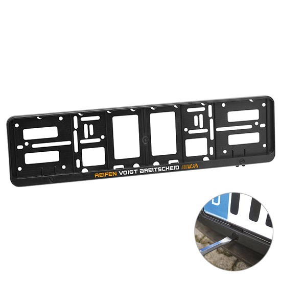 Nummernschild einlegen und mittels Schraubendreher beide Schlösser verriegeln. Bohrungen in der Rückwand des Kennzeichenhalters erleichtern die Montage am Fahrzeug. Für KfZ-Kennzeichen 520 x 110 mm.; Doming möglich.