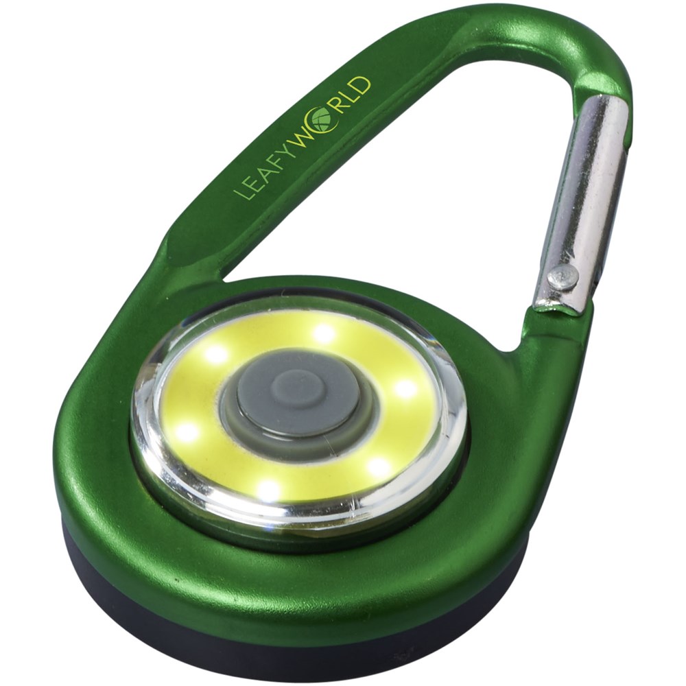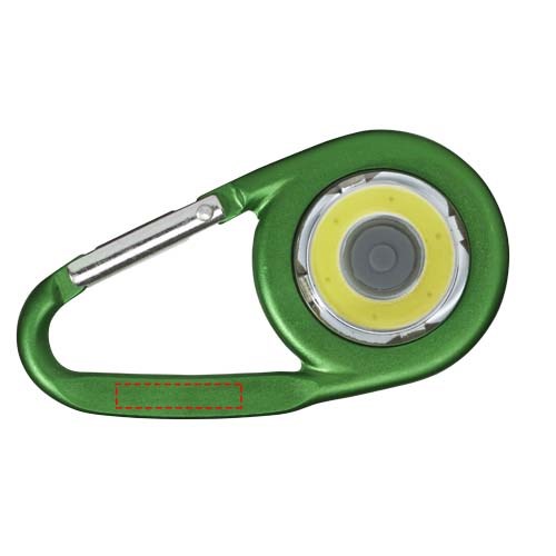 Karabiner mit COB LED Licht. Ein / Aus Schalter für hartes, weiches und blinkendes Licht. Flache Rückseite ideal für Werbeanbringung. Nicht zum Klettern geeignet. Inkl. Batterien.