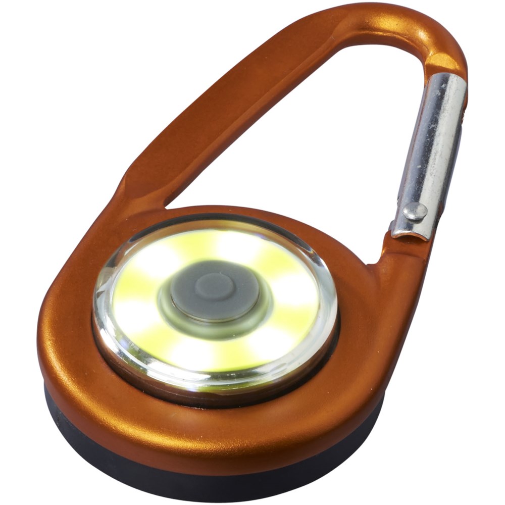 Karabiner mit COB LED Licht. Ein / Aus Schalter für hartes, weiches und blinkendes Licht. Flache Rückseite ideal für Werbeanbringung. Nicht zum Klettern geeignet. Inkl. Batterien.