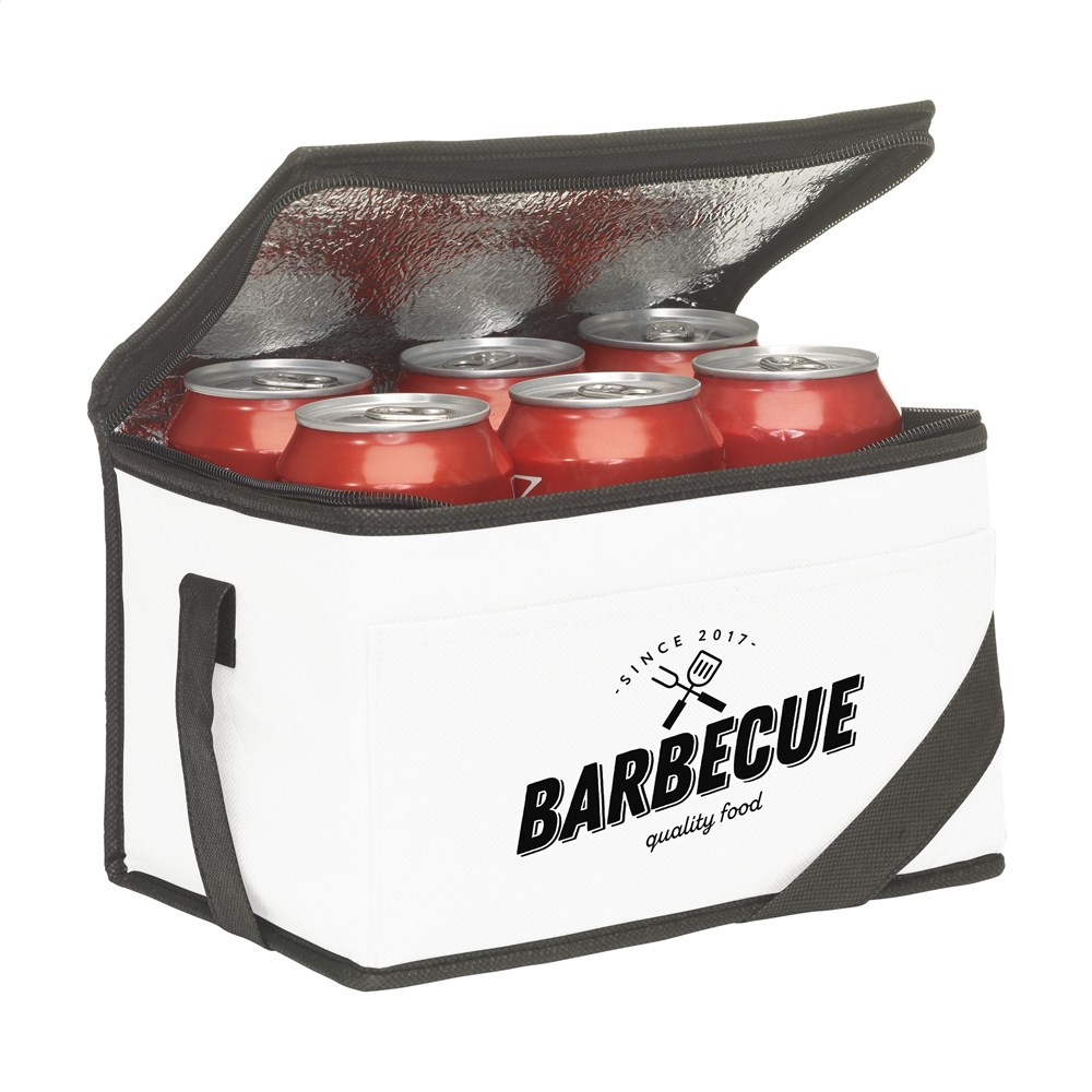Kühltasche aus Vliesstoff (80 g/m²), geeignet für 6 Getränkedosen oder Lebensmittel. Mit Trageriemen.