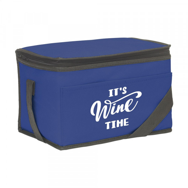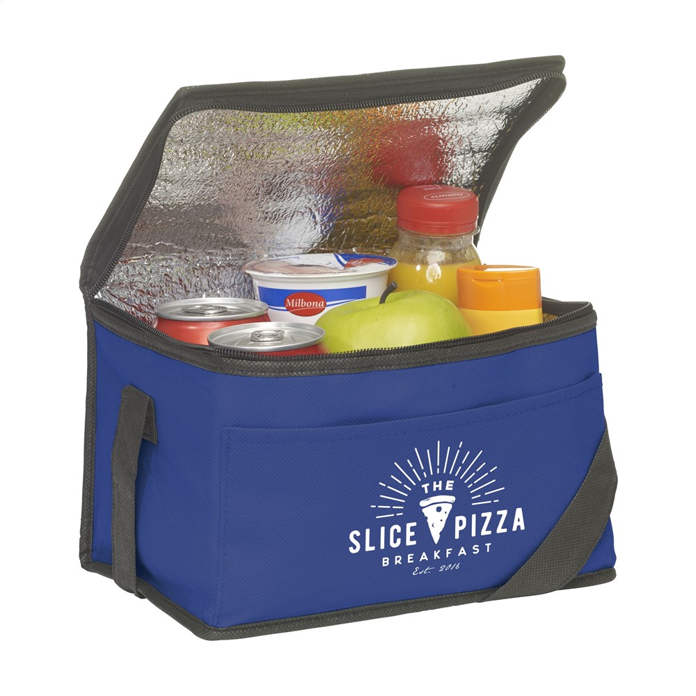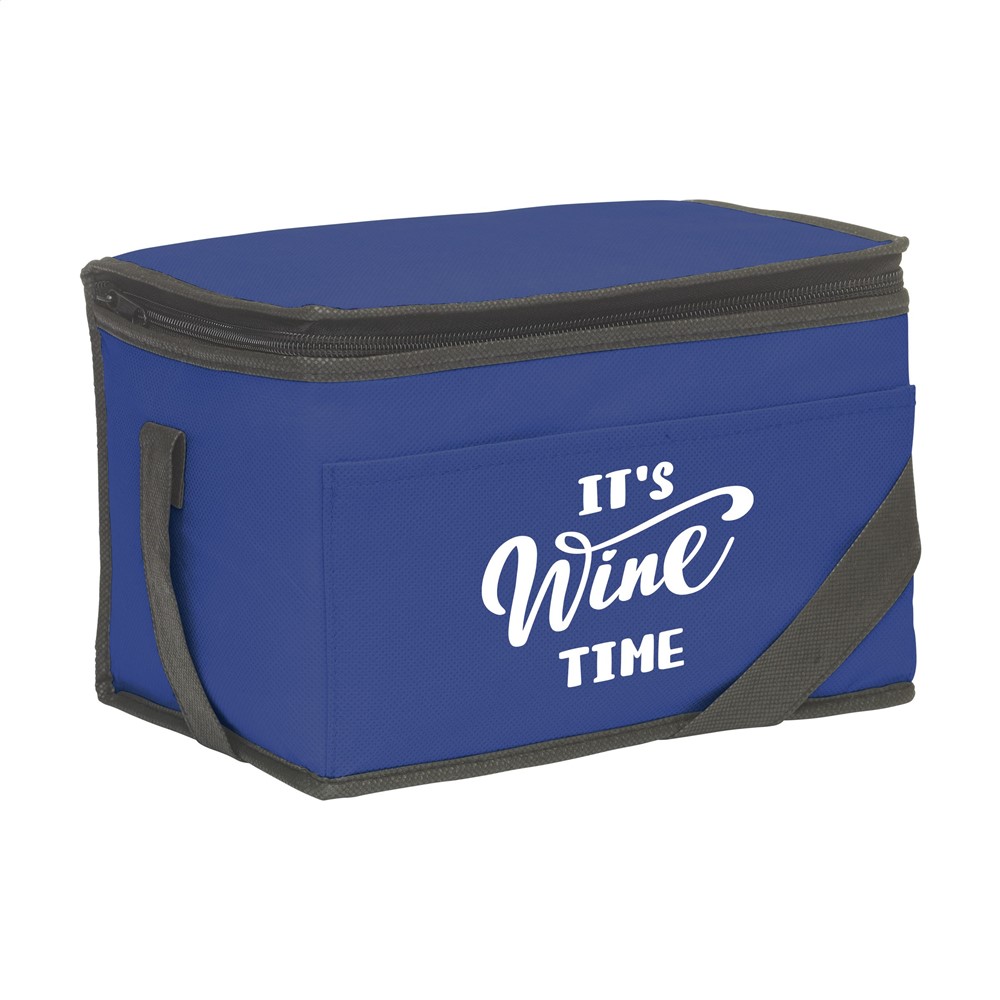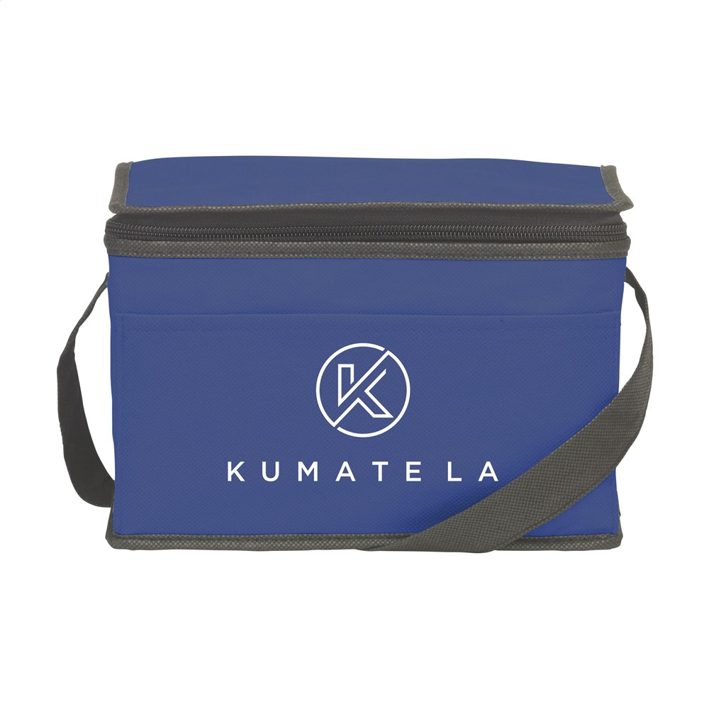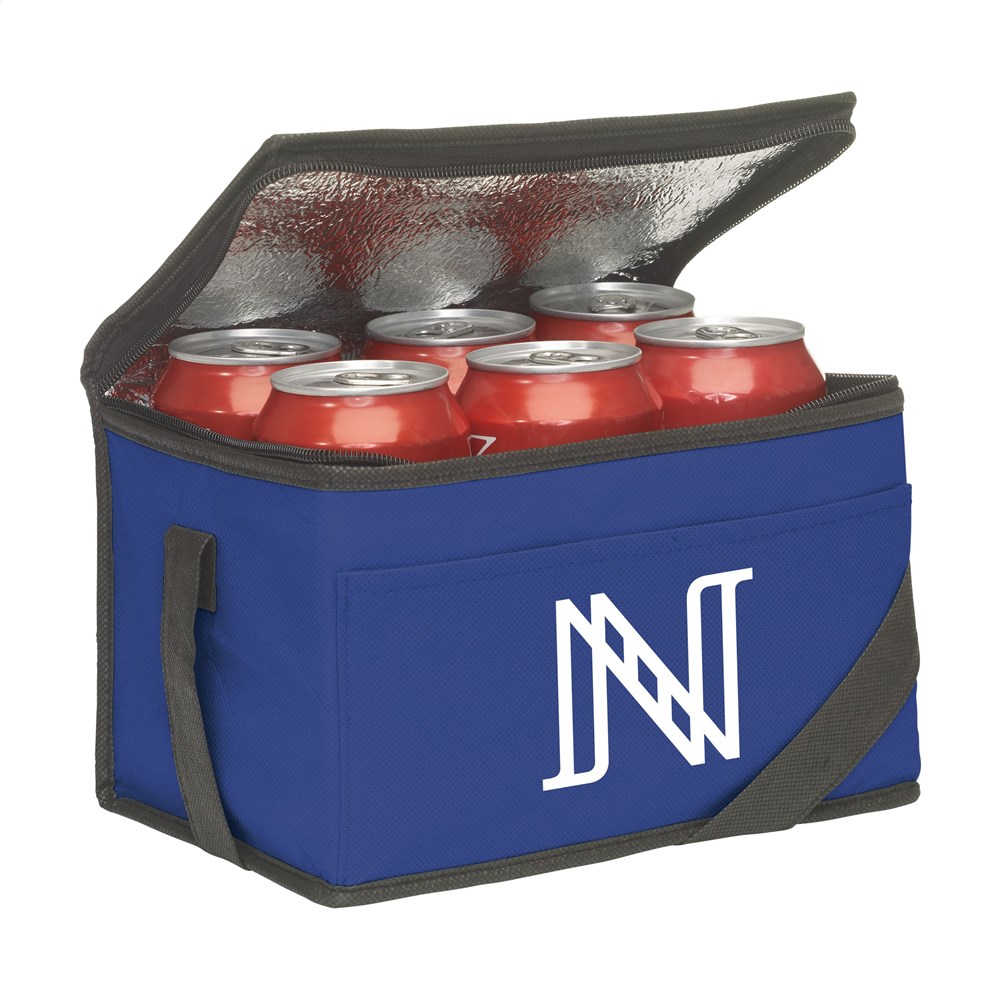 Kühltasche aus Vliesstoff (80 g/m²), geeignet für 6 Getränkedosen oder Lebensmittel. Mit Trageriemen.