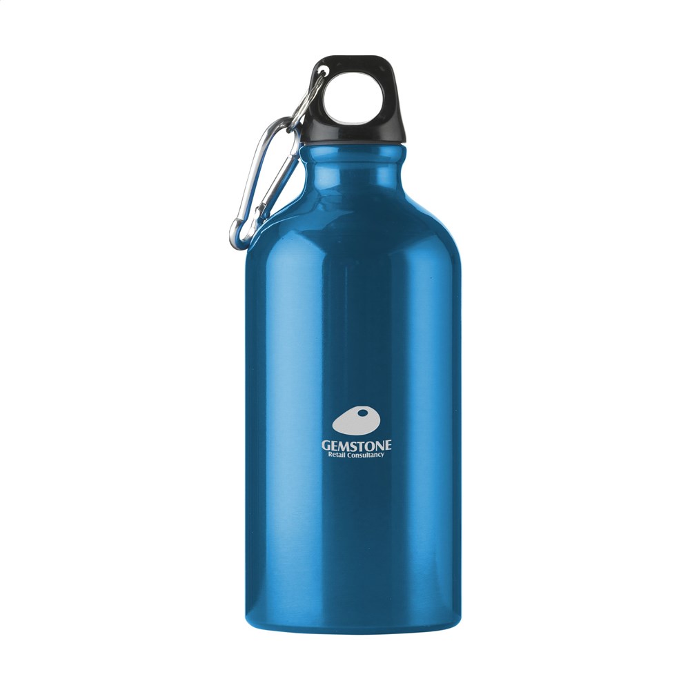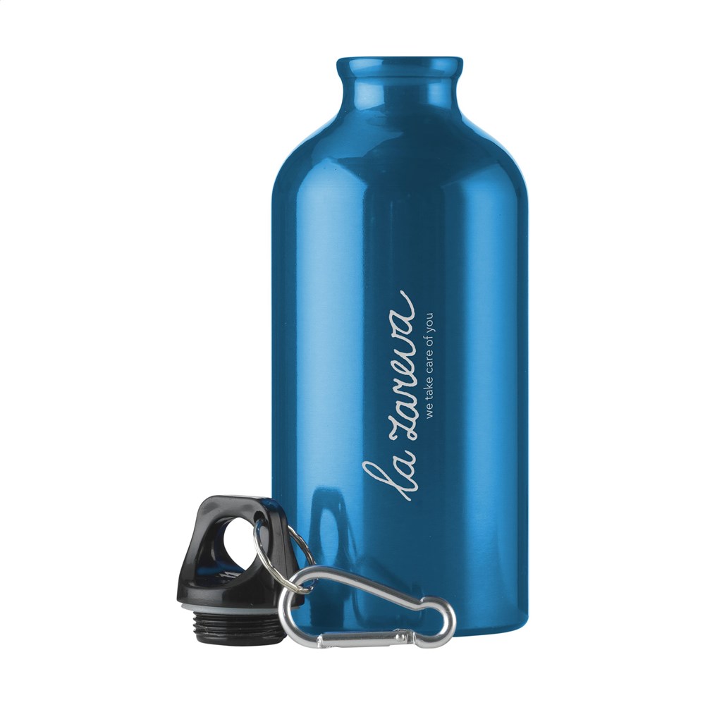 Einwandige, hochglanzpolierte Aluminium-Wasserflasche, Kunststoff-Schraubverschluss mit Schlüsselring und Metall-Karabinerhaken. Der Karabinerhaken ist nicht als Kletterwerkzeug geeignet. Tropffrei. Fassungsvermögen: 500 ml.