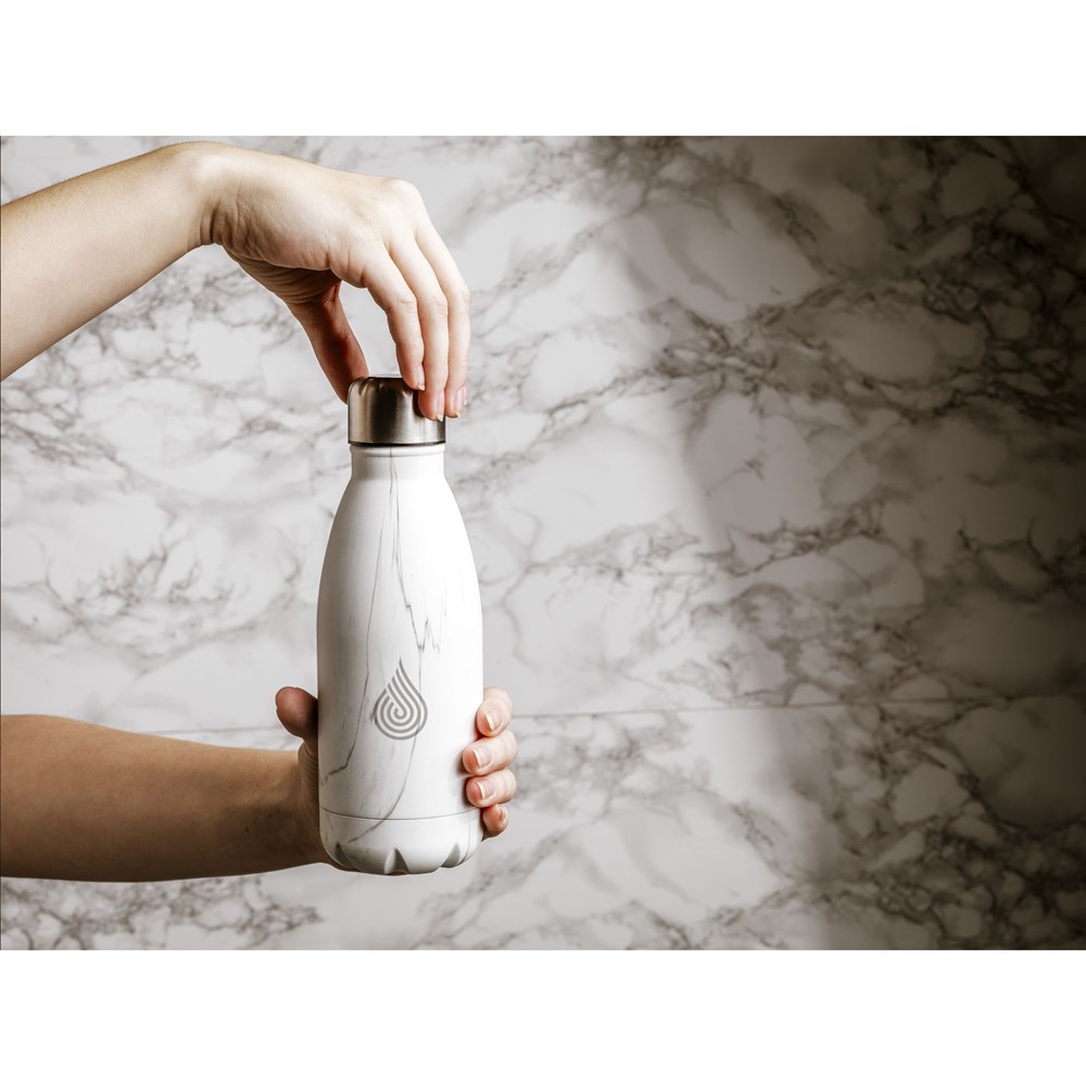 Doppelwandige, vakuumisolierte Edelstahl-Wasserflasche/Thermoflasche. Mit auslaufsicherem Schraubverschluss. Diese schicke Version hat eine auffallend schöne Oberschicht. Geeignet zur Temperaturerhaltung von kalten oder heißen Getränken. Fassungsvermögen: 350 ml. Pro Stück in einer Verpackung.