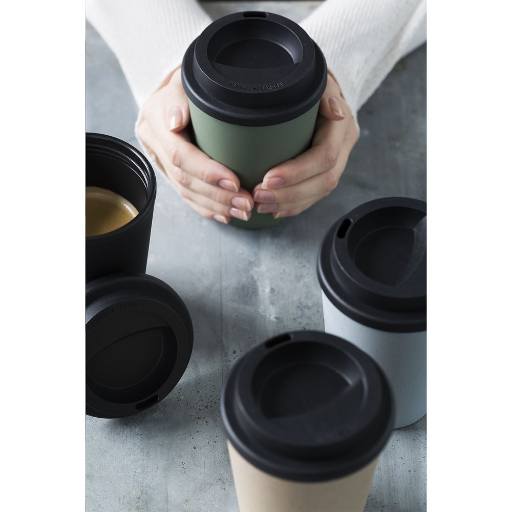 Wiederverwendbarer doppelwandiger Kaffeebecher-to-go aus PP-Kunststoff. Der Deckel hat eine Trinköffnung. Fassungsvermögen: 350 ml.