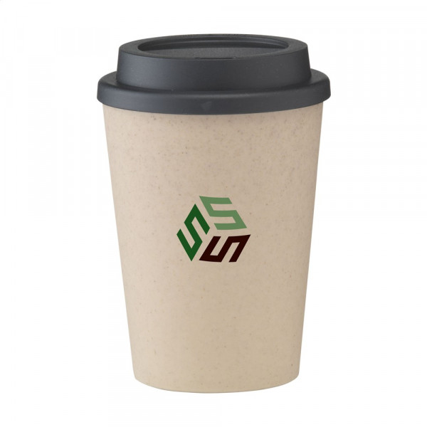 Wiederverwendbarer doppelwandiger Kaffeebecher-to-go aus PP-Kunststoff. Der Deckel hat eine Trinköffnung. Fassungsvermögen: 350 ml.
