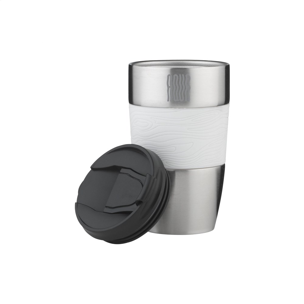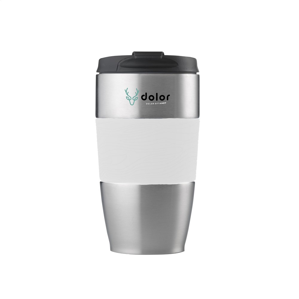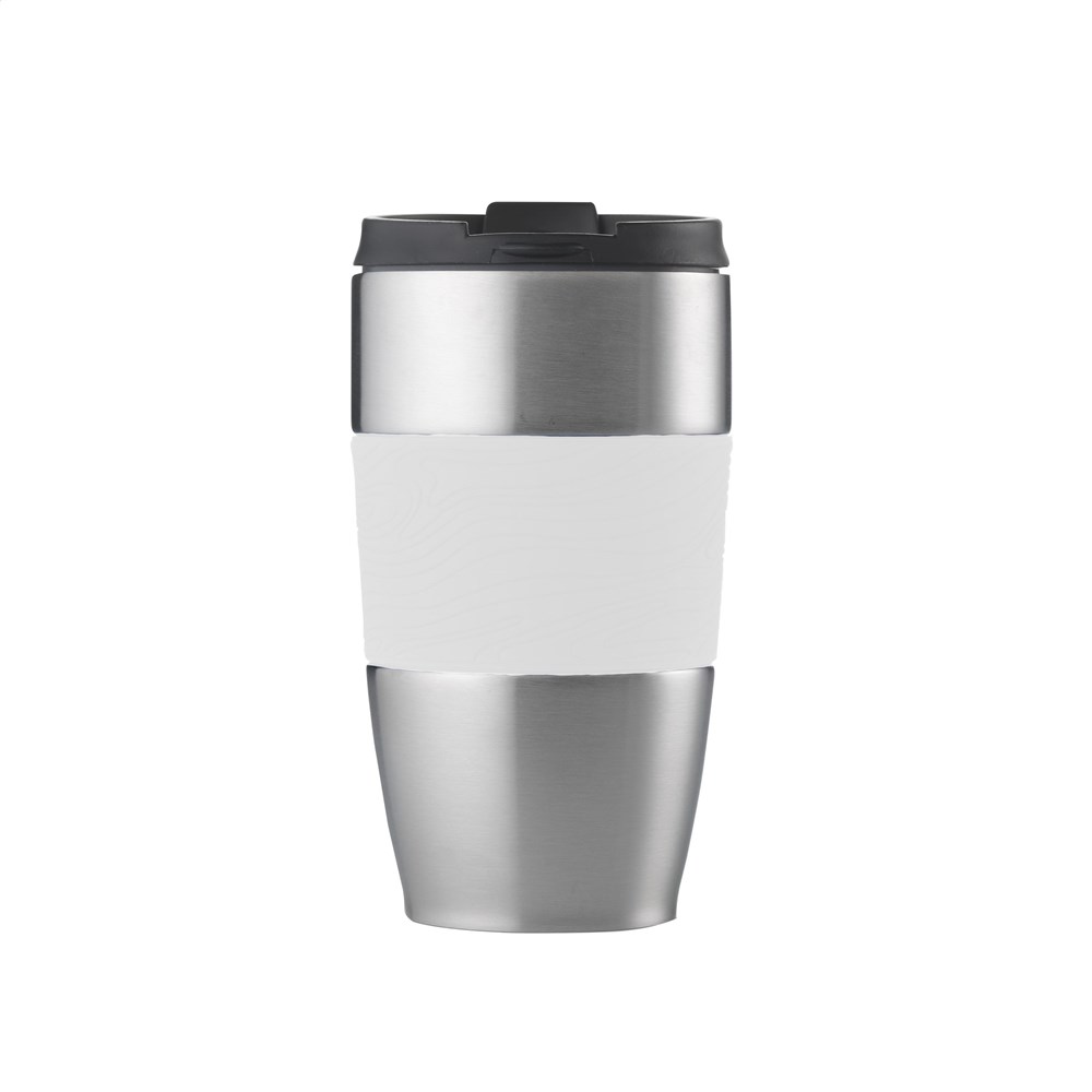 Doppelwandiger, dichter, rostfreier Edelstahl-Thermobecher mit Schraubverschluss, Klicköffnung -einmal öffnen und feststellen, das macht das Trinken angenehmer-, Gummigriff mit auffallendem Design und rutschfeste Unterseite. Hält Ihr Getränk lange auf der richtigen Temperatur. Nicht Spülmaschinengeeignet. Fassungsvermögen: 415 ml. Pro Stück in einer Verpackung.