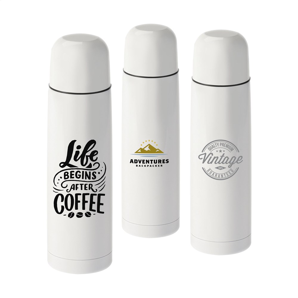Vakuumisolierte Edelstahl-Thermoflasche mit Schraubverschluss/Trinkbecher und handlichem Schanksystem mit Druckverschluss. Fassungsvermögen 500 ml. Pro Stück in einer Verpackung.