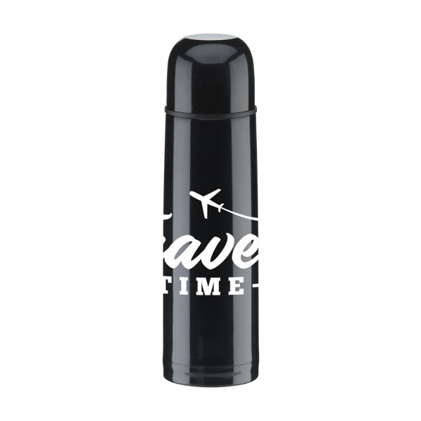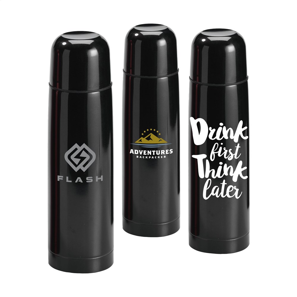 Vakuumisolierte Edelstahl-Thermoflasche mit Schraubverschluss/Trinkbecher und handlichem Schanksystem mit Druckverschluss. Fassungsvermögen 500 ml. Pro Stück in einer Verpackung.