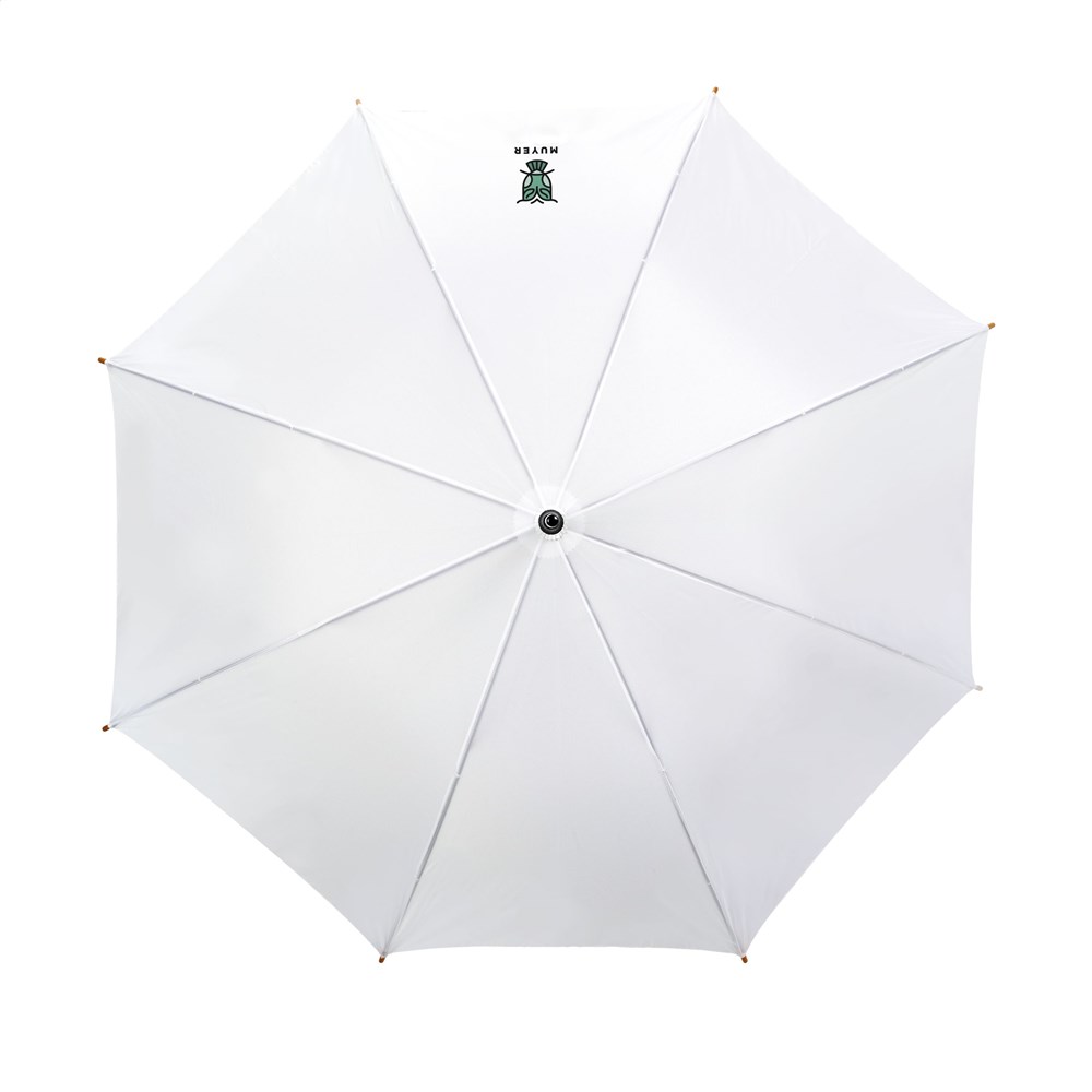 Regenschirm mit automatischer Teleskopöffnung, 190T Polyesterbespannung, Metallrahmen, Handgriff und Schaft aus Holz und Klettverschluss.