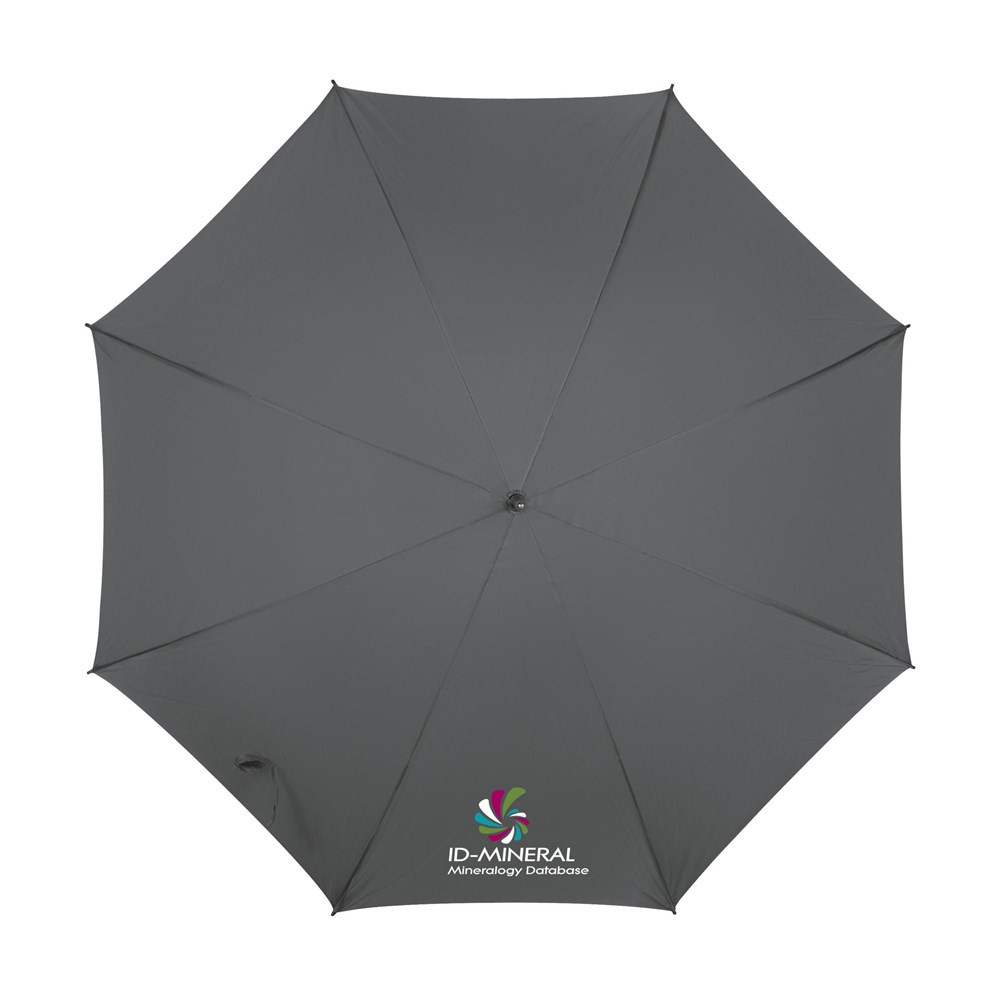 Regenschirm mit einem Durchmesser von 120 cm, 190T Nylonbespannung, Metallgestell und -schaft, Holzgriff und Klettverschluss.
