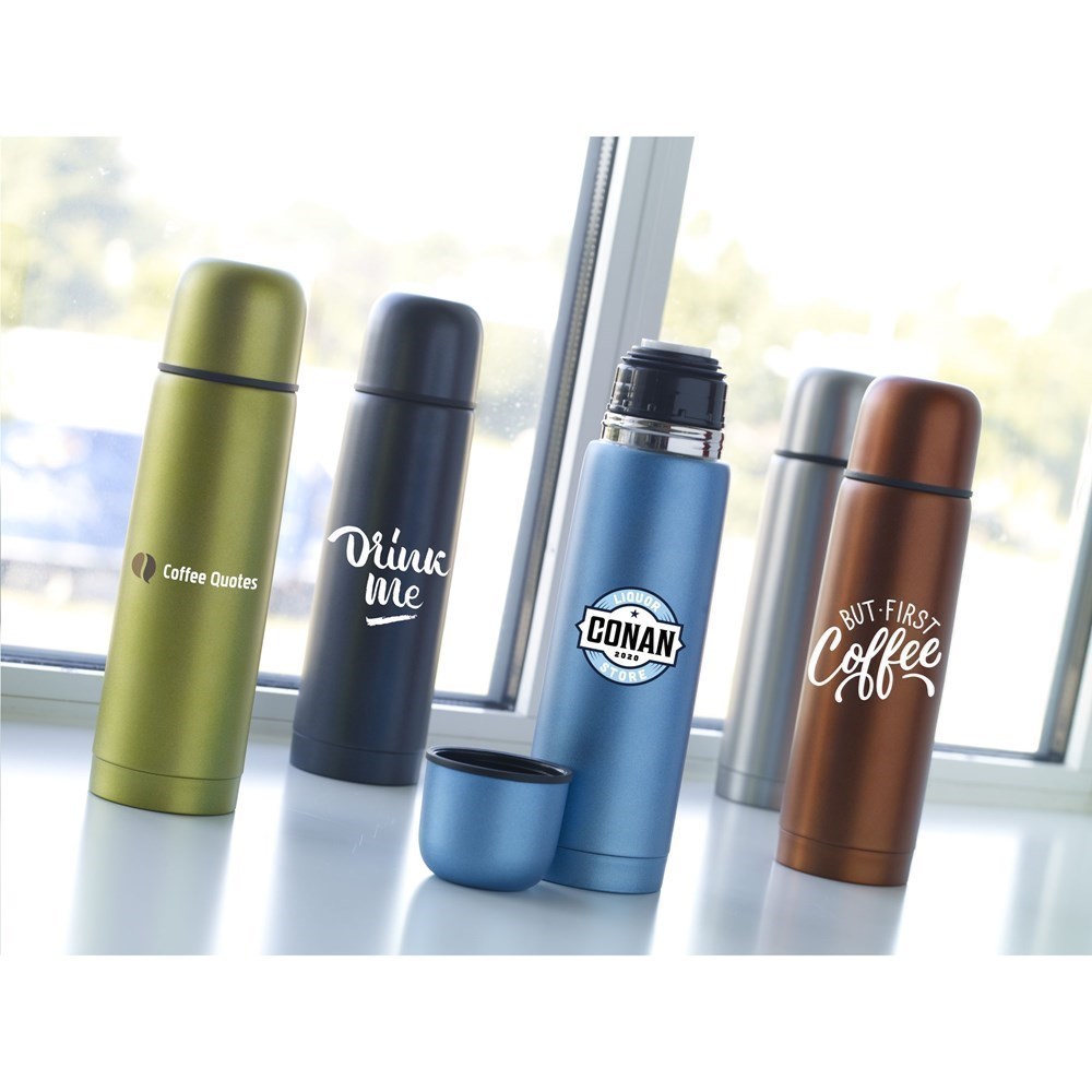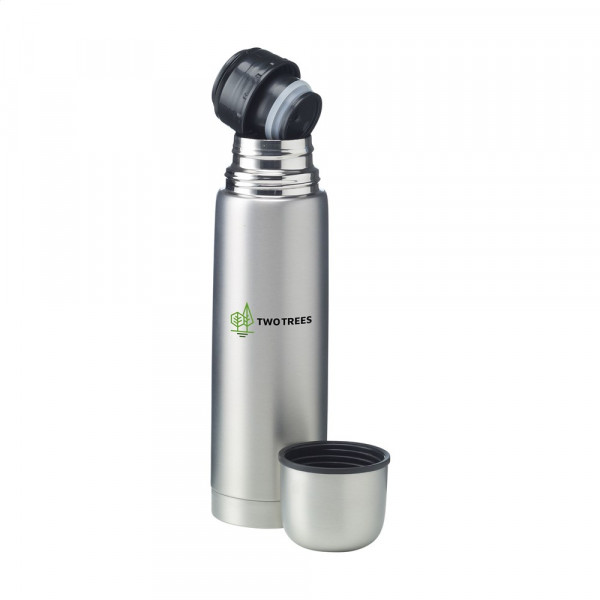 Doppelwandige, vakuumisolierte, rostfreie Edelstahl Thermoflasche mit doppeltem Schraubkopf und einem nützlichen Schanksystem. Der Deckel ist auch als Trinkbecher zu gebrauchen. Abgerundet durch ein gefrostetes Metallfinish. Fassungsvermögen: 500 ml. Pro Stück in einer Verpackung.