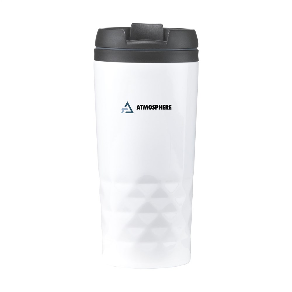 Doppelwandiger, auslaufsicherer Edelstahl-Thermobecher mit Schraubdeckel und Klicköffnung. PP-Innenwand. Mit auffallendem geometrischem 3D-Rautenmuster im Halter. Rutschfester Boden. Tropfsicher. Fassungsvermögen: 300 ml. Pro Stück in einer Verpackung.