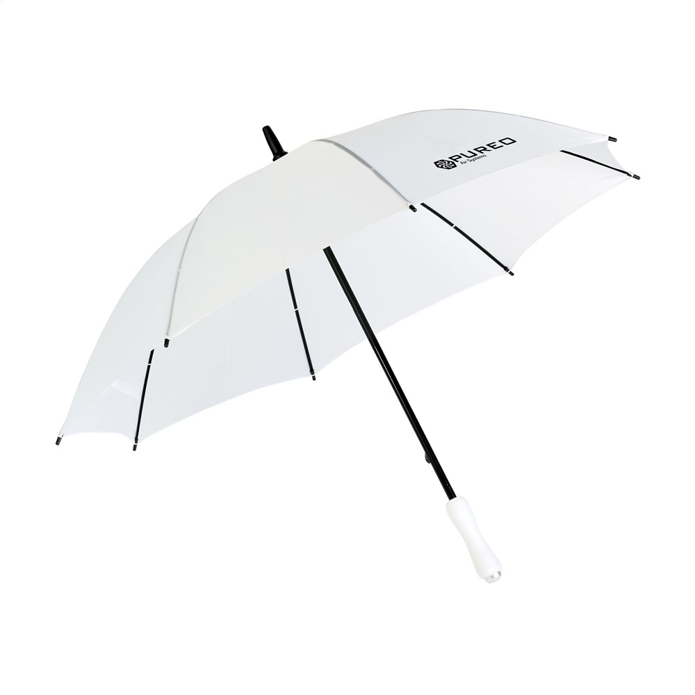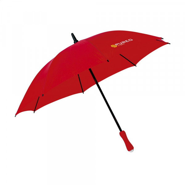 Regenschirm mit Nylon Bespannung, Metallrahmen und Schaft, Tips aus Kunststoff und vorgeformten Softhandgriff. Im praktischen Beutel mit Tragekordel.