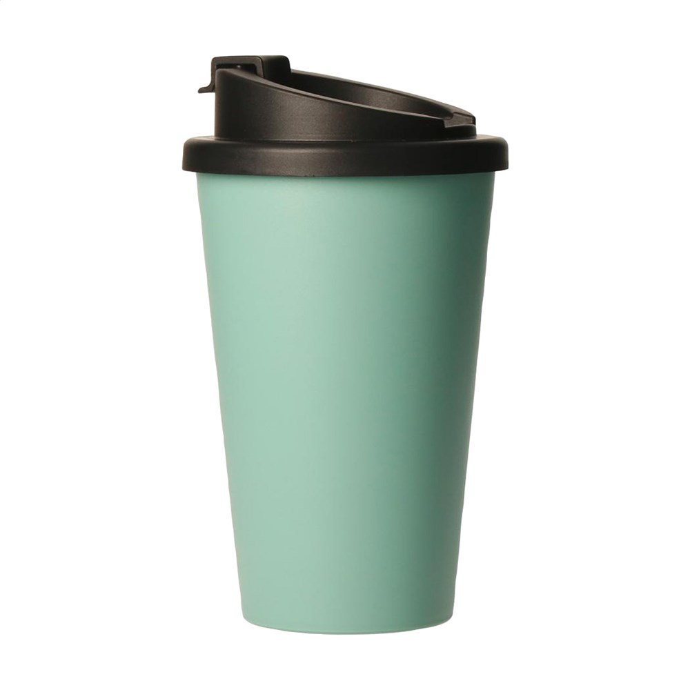 Doppelwandiger Thermobecher-To-Go aus 100% recycelbarem Biokunststoff. Hält heiße oder kühle Getränke auf Temperatur. Dieser haltbare Becher hat einen Deckel mit Schraubverschluss mit einer Trinköffnung mit einem integriertem Verschluss um versehentliches Auslaufen zu verhindern. Passt in den Standard-Trinkbehälter von Autos, was praktisch für unterwegs ist. Umweltfreundlich, BPA-frei, lebensmittelecht, geruchs- und geschmacksneutral. Fassungsvermögen: 350 ml. Made in Germany. Die Oberfläche eignet sich ideal für den iMould-Vierfarben-Aufdruck (wasser-, kratz-, farb- und UV-beständig) in jedem gewünschten Design.