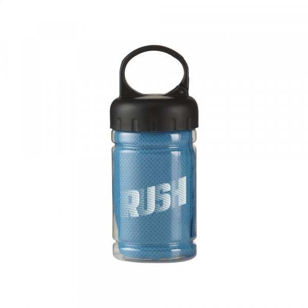 Spezielles Kühlhandtuch aus 100 % Polyester. Nach dem Eintauchen in kaltes Wasser kann dieses Handtuch bei sportlichen Aktivitäten oder Sonnenbrand kühlen. Maße 30 x 80 cm. Ideales Format, um es zur Kühlung im Nacken zu tragen. In transparentem Gehäuse mit ABS-Schraubverschluss mit Karabinerhaken.