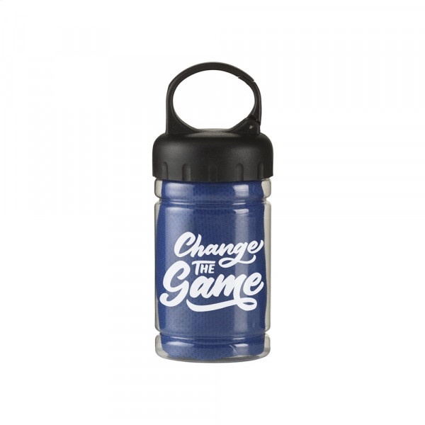 Spezielles Kühlhandtuch aus 100 % Polyester. Nach dem Eintauchen in kaltes Wasser kann dieses Handtuch bei sportlichen Aktivitäten oder Sonnenbrand kühlen. Maße 30 x 80 cm. Ideales Format, um es zur Kühlung im Nacken zu tragen. In transparentem Gehäuse mit ABS-Schraubverschluss mit Karabinerhaken.