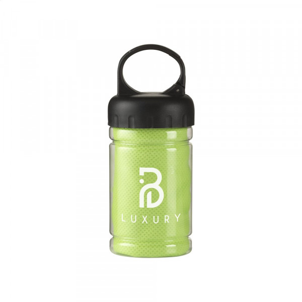 Spezielles Kühlhandtuch aus 100 % Polyester. Nach dem Eintauchen in kaltes Wasser kann dieses Handtuch bei sportlichen Aktivitäten oder Sonnenbrand kühlen. Maße 30 x 80 cm. Ideales Format, um es zur Kühlung im Nacken zu tragen. In transparentem Gehäuse mit ABS-Schraubverschluss mit Karabinerhaken.