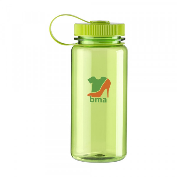 Transparente, BPA-freie AS-Wasserflasche mit Schraubverschluss und großzügiger Trinköffnung. Leicht zu reinigen und auslaufsicher. Fassungsvermögen: 650 ml.