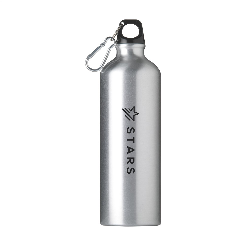 Einwandige, hochglanzpolierte Wasserflasche aus Aluminium, Schraubverschluss aus Kunststoff mit Schlüsselring und Karabinerhaken aus Metall. Der Karabinerhaken ist nicht als Kletterwerkzeug geeignet. Auslaufsicher. Fassungsvermögen: 750 ml.