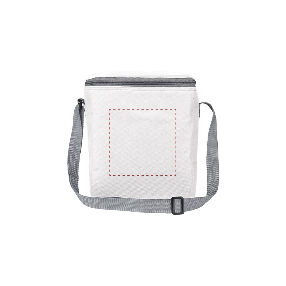 600D-Polyester-Kühltasche, geeignet für 6 Getränkeflaschen (Inhalt 500 ml) oder 12 Dosen. Mit Trageriemen.