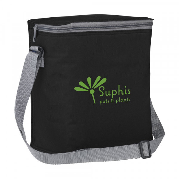 600D-Polyester-Kühltasche, geeignet für 6 Getränkeflaschen (Inhalt 500 ml) oder 12 Dosen. Mit Trageriemen.