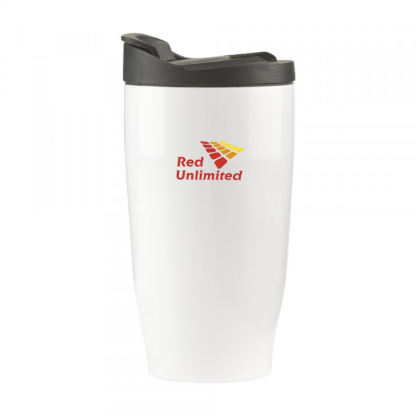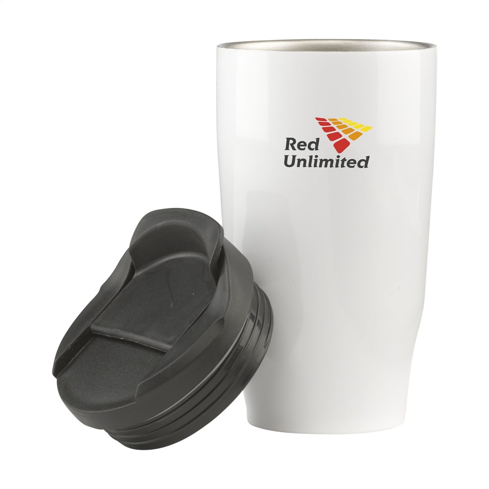 Doppelwandiger Thermobecher aus rostfreiem Edelstahl in trendiger Ausführung. Mit Schraubverschluss und Klick-Öffnung. Tropfsicher. Hält sowohl warme wie auch kalte Getränke lange auf Temperatur. Rutschfeste Unterseite. Ausführung in gebürstetem Edelstahl oder in glänzendem Weiß. Fassungsvermögen: 470 ml. Pro Stück in einer Verpackung.