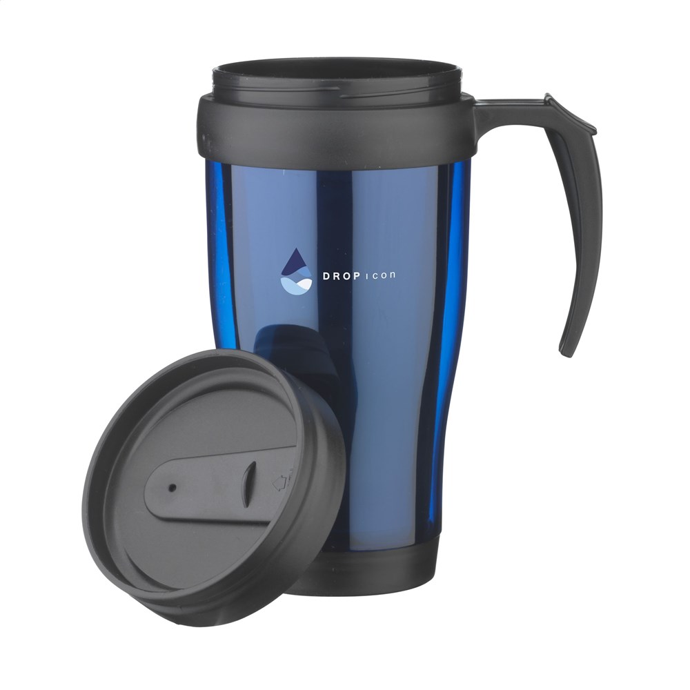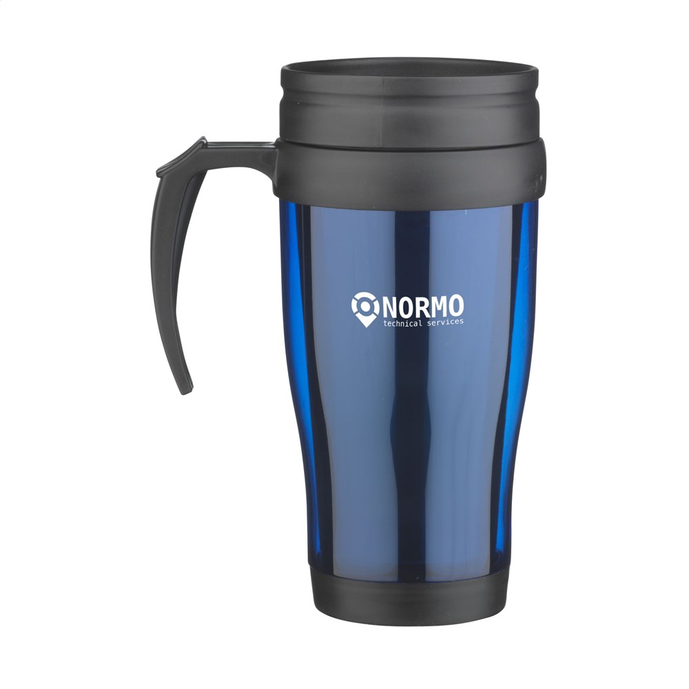 Doppelwandiger Kunststoff Thermobecher mit Schraubdeckel und Schiebe-/Klicköffnung (ohne Gummidichtung). Fassungsvermögen: 400 ml. Pro Stück in einer Verpackung.