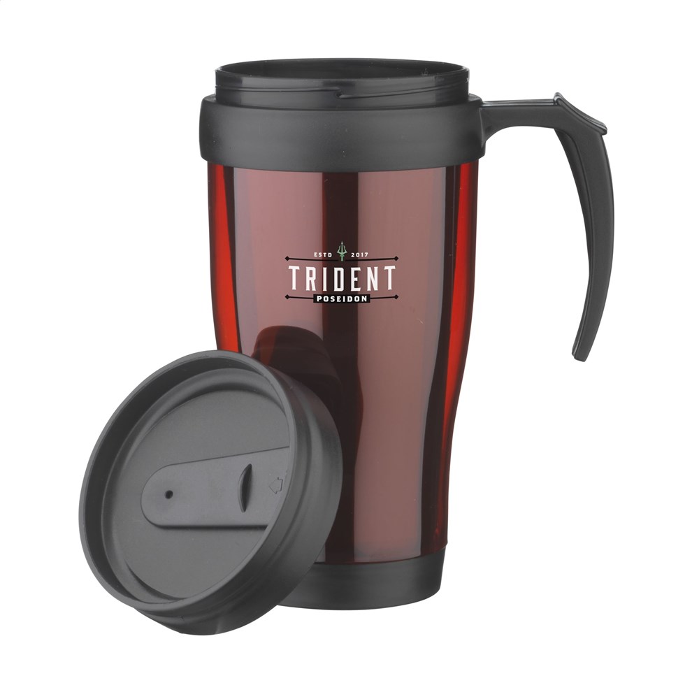 Doppelwandiger Kunststoff Thermobecher mit Schraubdeckel und Schiebe-/Klicköffnung (ohne Gummidichtung). Fassungsvermögen: 400 ml. Pro Stück in einer Verpackung.