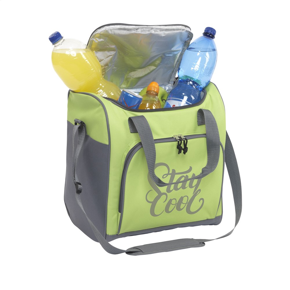 Feste Kühltasche aus 600D Polyester. Mit einem großen Kühlfach und einer Reissverschlusstasche, anpassbarem Schulterriemen mit Schulterpolster und 2 Griffen. Großes Fach: passend für 6 Flaschen mit bis zu 2 Litern.