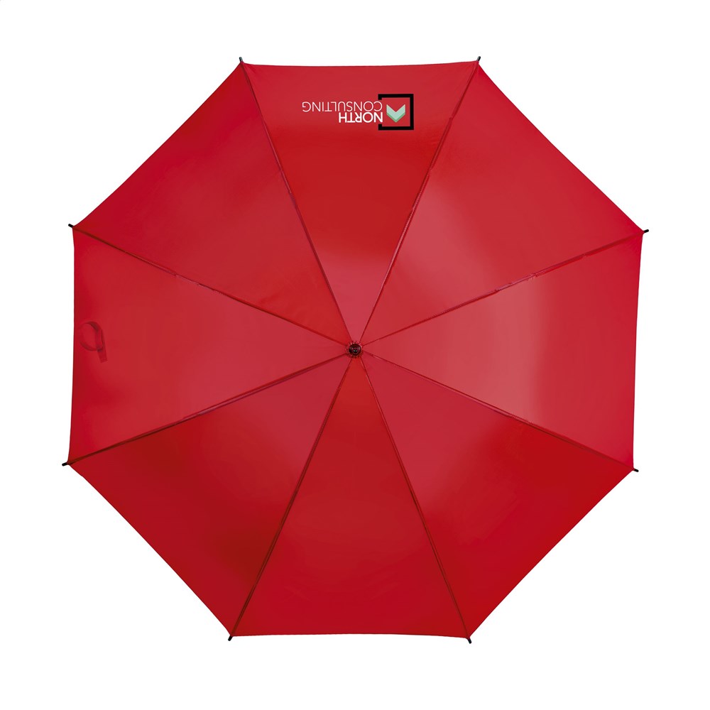 Regenschirm mit automatischer Teleskopöffnung. 190T Polyesterbespannung, Fiberglasrahmen, Metallstiel, Klettverschluss, gebogenem, klassischem Handgriff, der durch die luxuriöse Gummiummantelung gut in der Hand liegt.