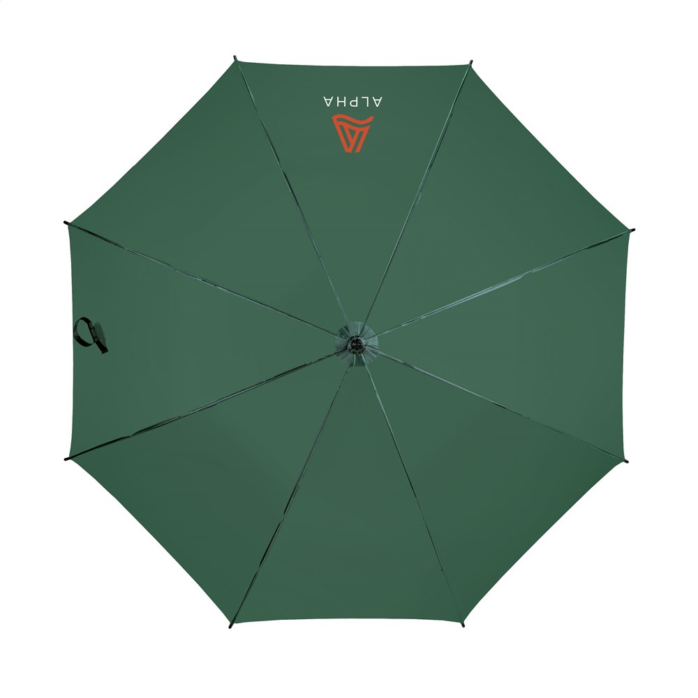 Regenschirm mit automatischer Teleskopöffnung. 190T Polyesterbespannung, Fiberglasrahmen, Metallstiel, Klettverschluss, gebogenem, klassischem Handgriff, der durch die luxuriöse Gummiummantelung gut in der Hand liegt.