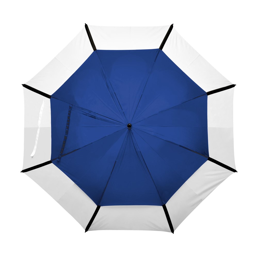 Luxuriöser, doppellagiger Golfschirm mit 190T Polyester- und 190T Nylonbespannung, Sturmfunktion, Windbreakersystem, Glasfaserrahmen und -stiel,vorgeformtem Soft-Handgriff und doppel tem Klettverschluss. In einer Verwahrhülle.