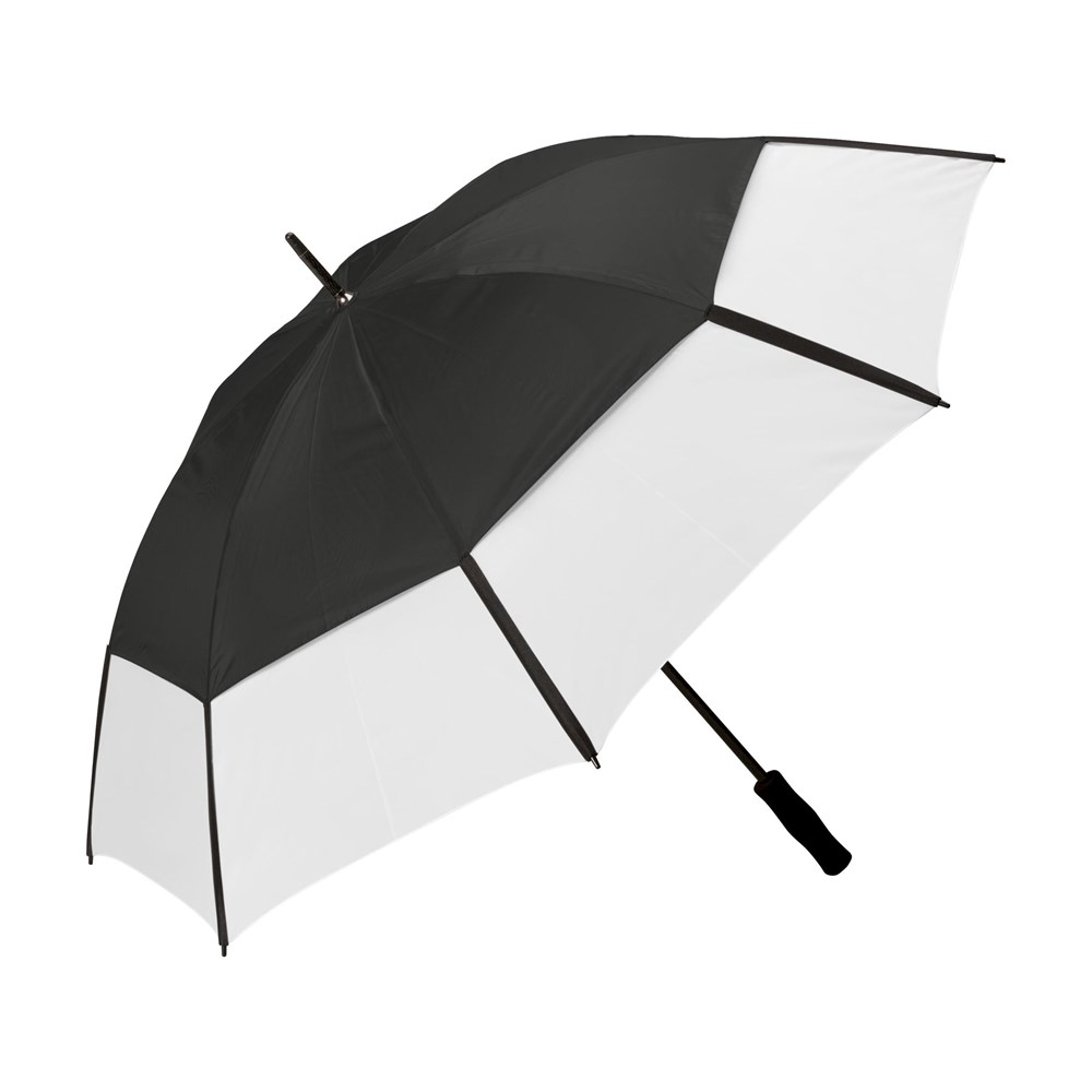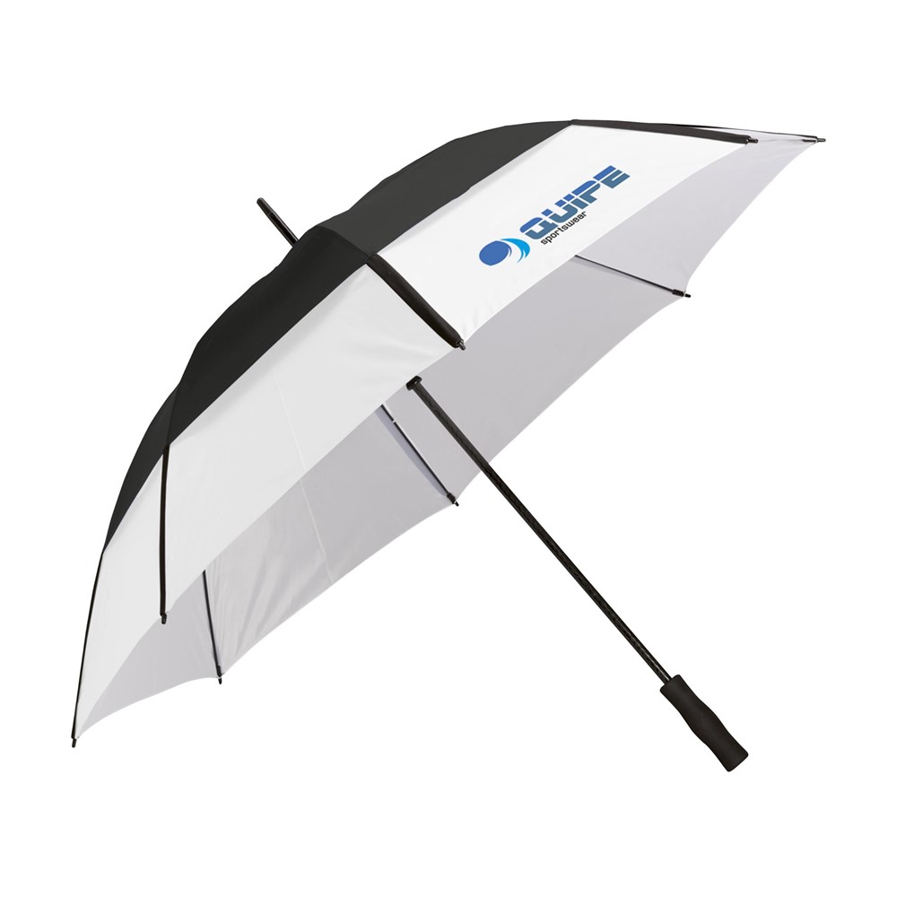 Luxuriöser, doppellagiger Golfschirm mit 190T Polyester- und 190T Nylonbespannung, Sturmfunktion, Windbreakersystem, Glasfaserrahmen und -stiel,vorgeformtem Soft-Handgriff und doppel tem Klettverschluss. In einer Verwahrhülle.