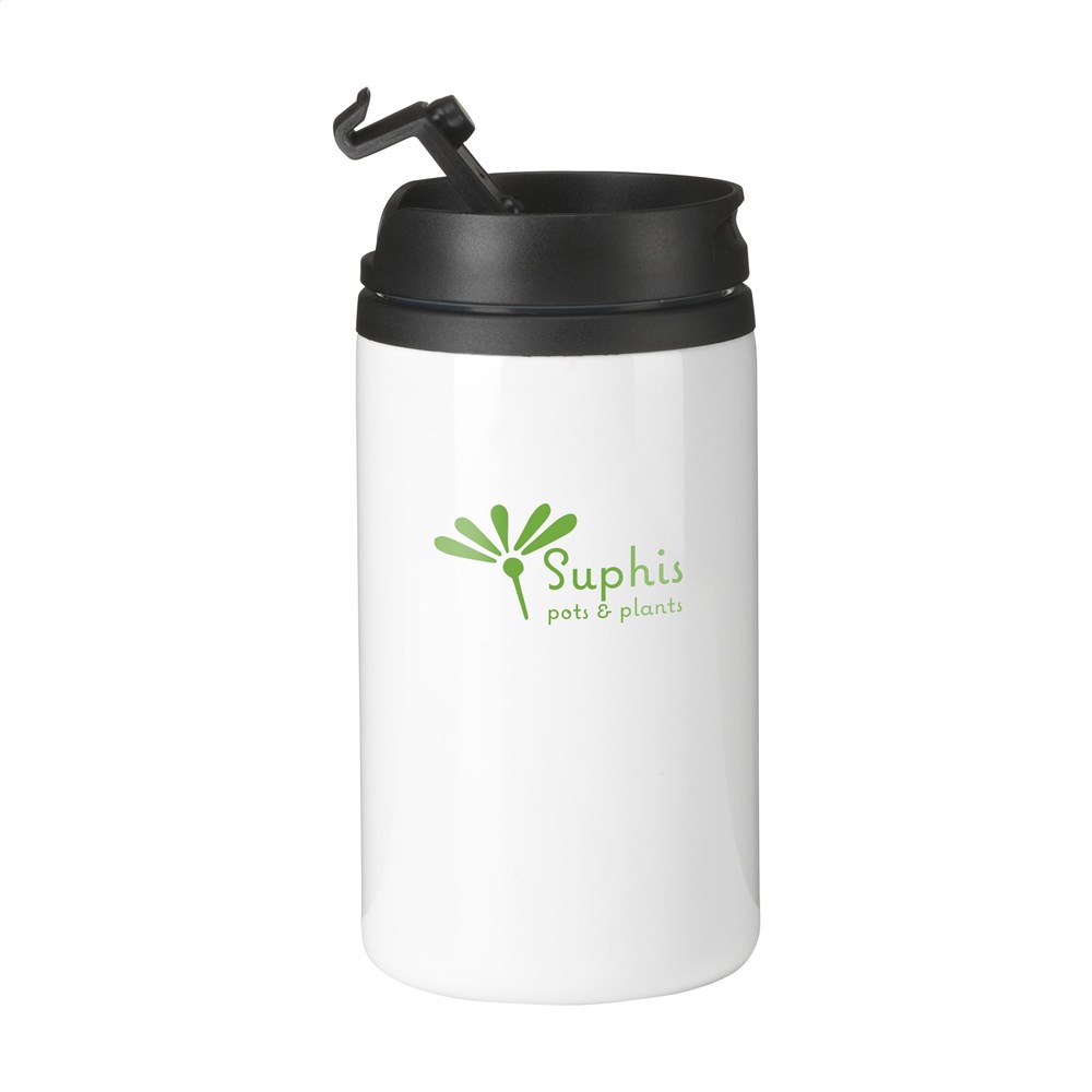 Doppelwandiger Thermobecher, außen aus Edelstahl in Metalloptik und innen aus Kunststoff, Schraubverschluss mit Klicköffnung und Antirutschfunktion. Tropffrei. Fassungsvermögen: 300 ml. pro Stück in einer Box.