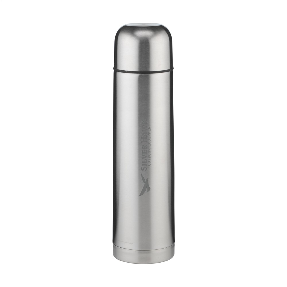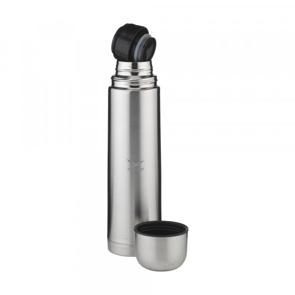 Doppelwandige, vakuumisolierte, rostfreie Edelstahl-Thermoflasche mit Schraubdeckel/Trinkbecher und handlichem Schanksystem mit Druckverschluss. Fassungsvermögen: 1000 ml. Pro Stück in einer Verpackung.