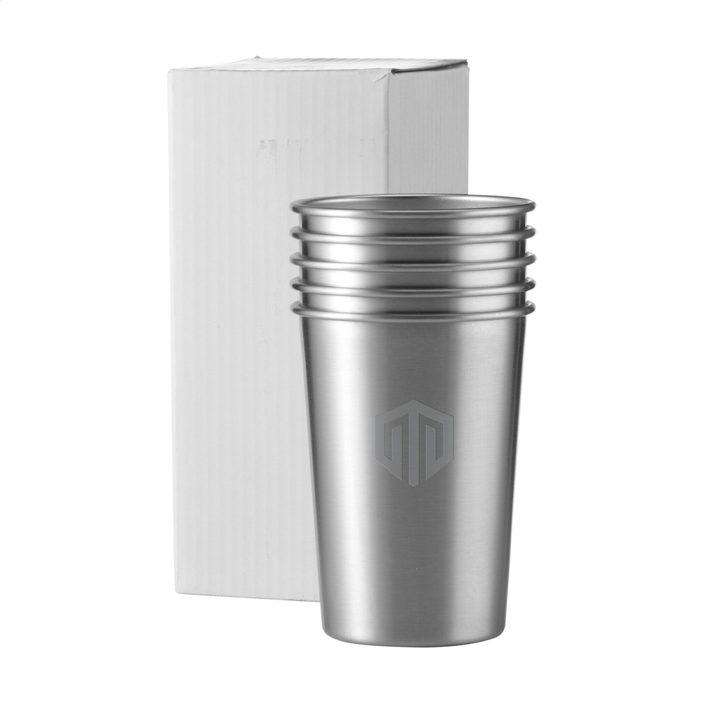 Unverwüstlicher, wiederverwendbarer Trinkbecher aus Edelstahl. Einwandig. Fassungsvermögen: 350 ml. Verpackt pro 5 Stück in einer Dose.